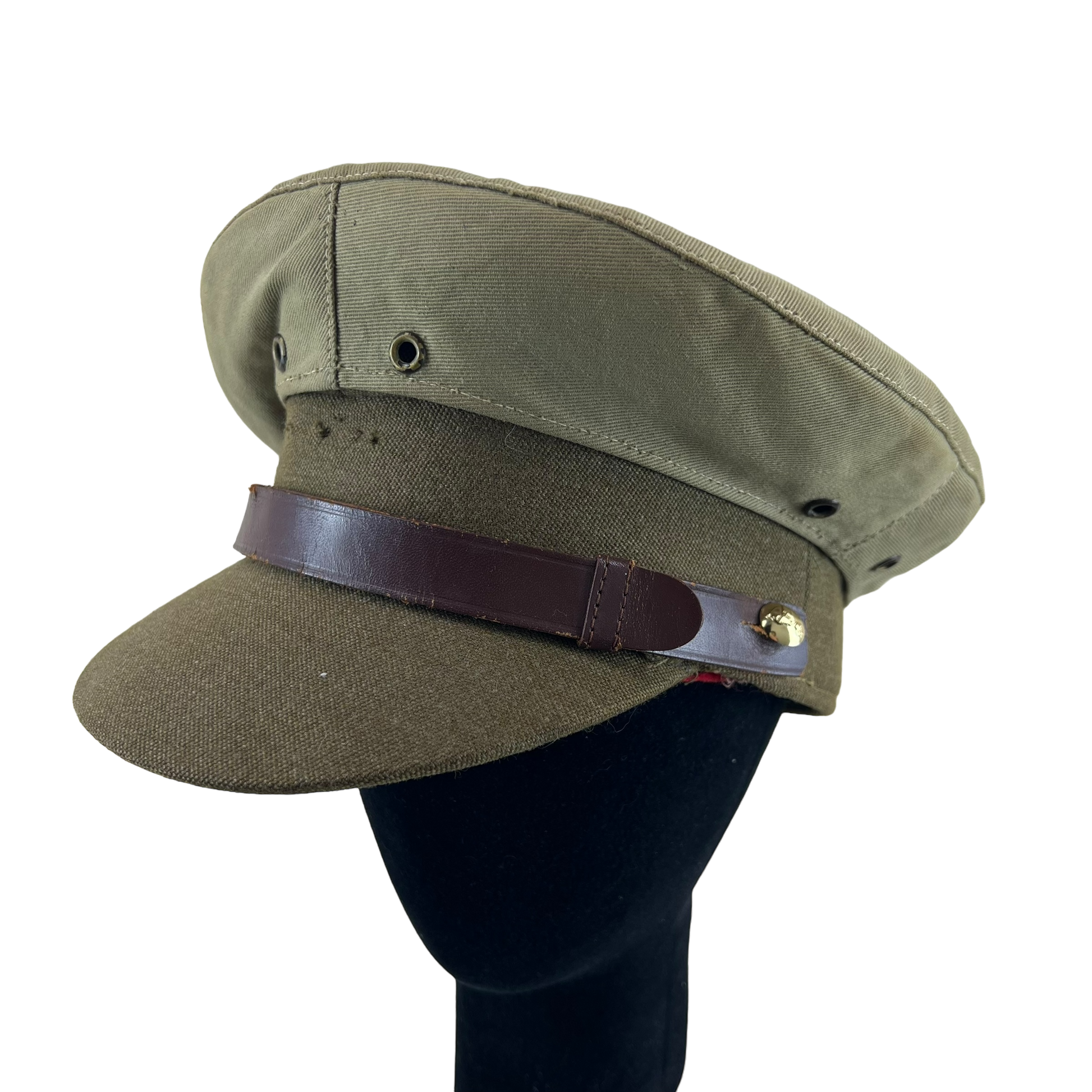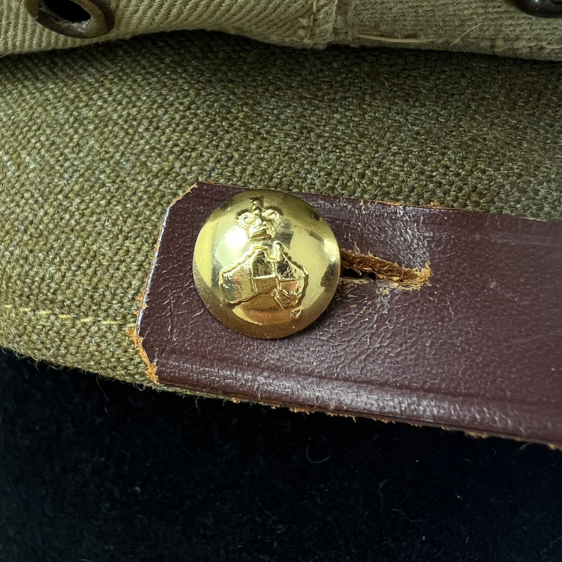 The colour is a dark olive green / olive drab, that has contrasting embossed gold buttons that feature Australia and her regions. There's also a a rich coffee coloured leather (possibly synthetic?) trim / band above the visor. Usually there would be a beautiful cap badge in the centre, but sadly this cap's badge seems to be missing, but there is still the holes to put a new one into! There's also a khaki dust cover which can be unhooked at the rear.