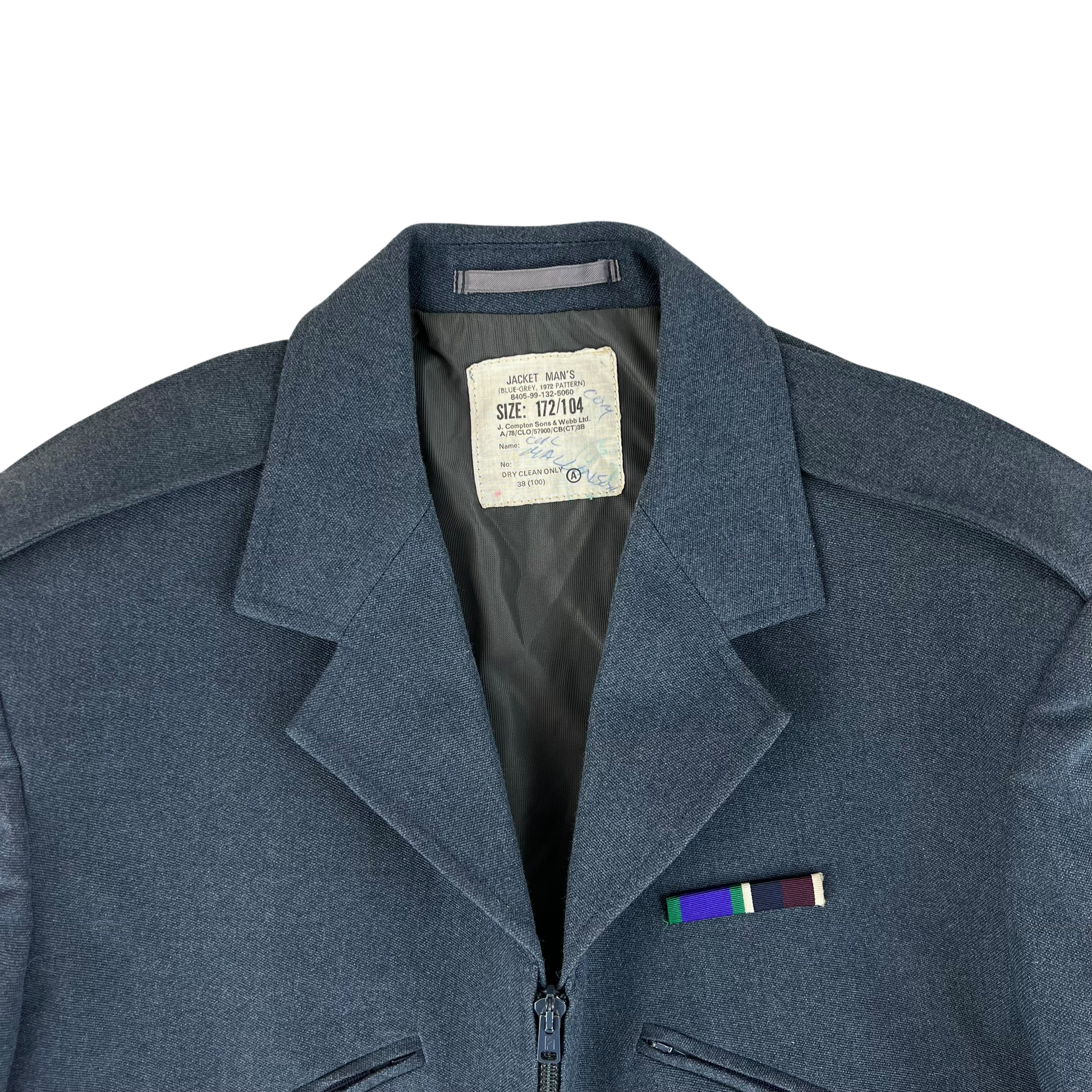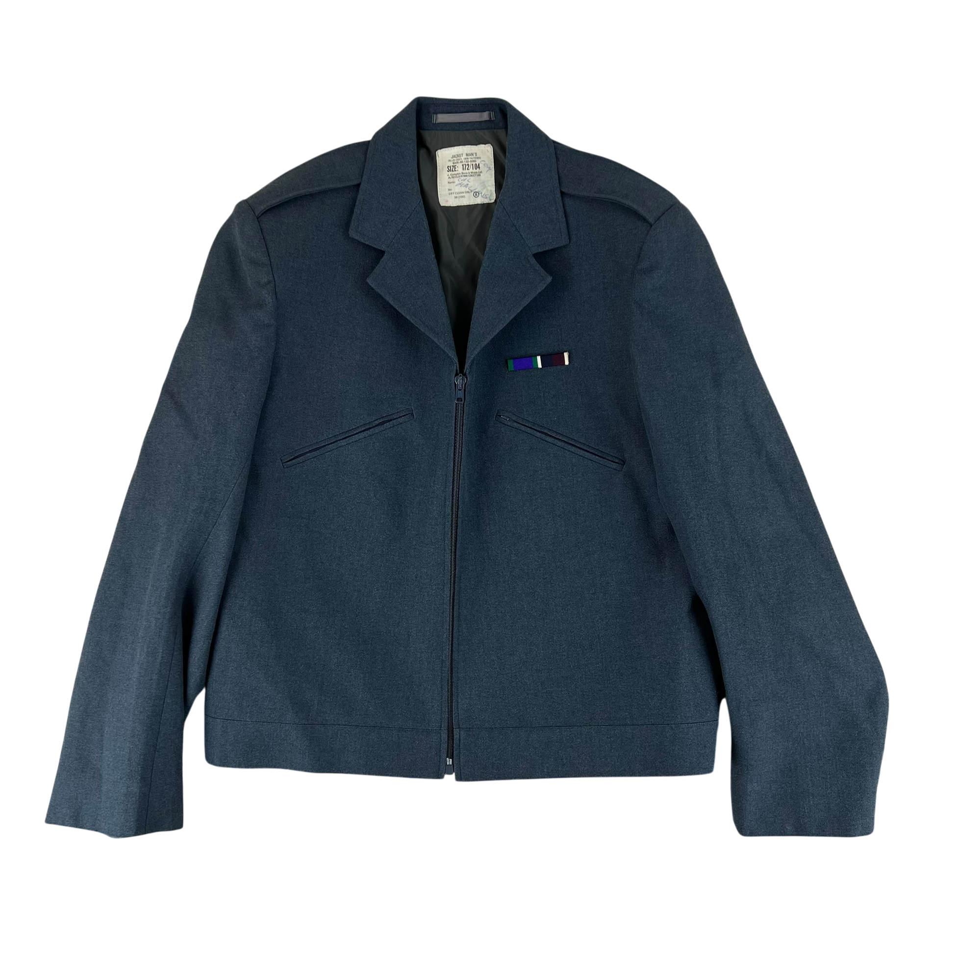 The jacket itself is the precursor to the now well known GP bomber jacket. This older 1972 pattern design is cut in a style fitting to the time, with 2 slanted zipper pockets for storage and a front zipper closure. It is made of an all wool material in the beautiful RAF blue colour. The wool of course offering wind and water resistance in the middling to summer months. The jacket is a great piece of history without being exceptionally ornate as the stunning dress jackets usually are, but certainly showcase well a rich life in the field.