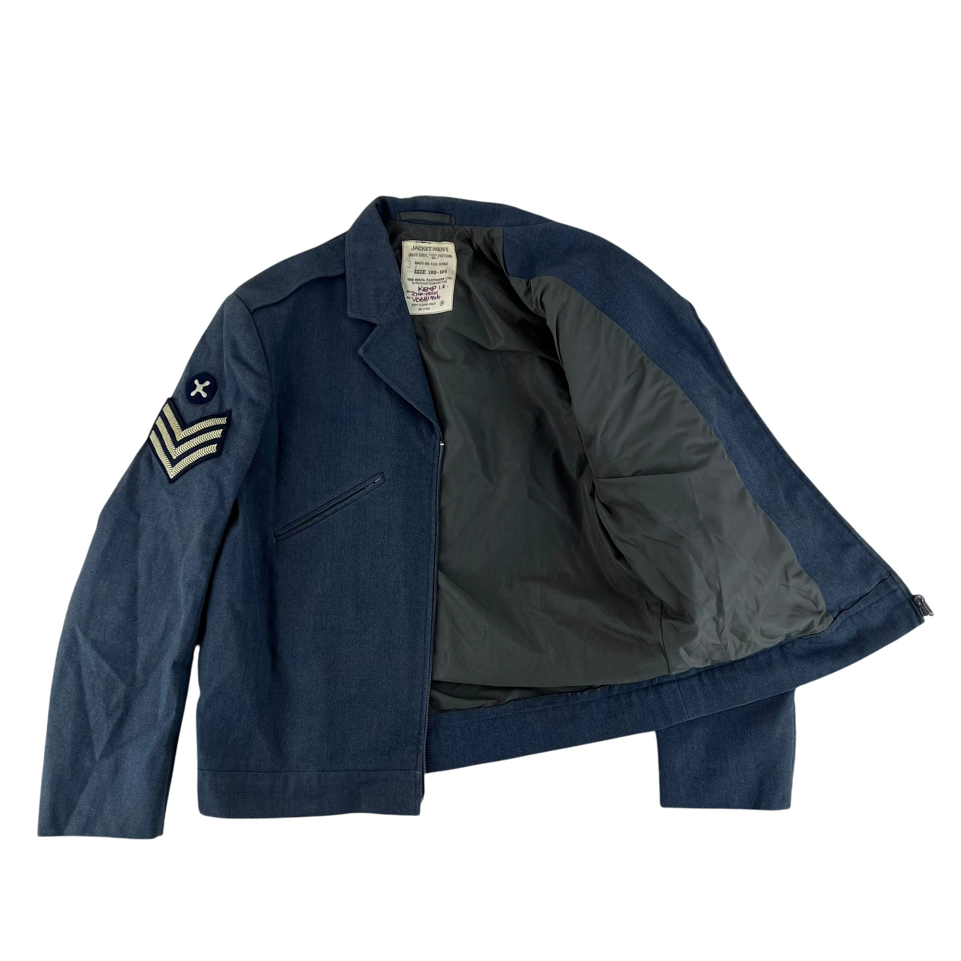 The jacket itself is the precursor to the now well known GP bomber jacket. This older 1972 pattern design is cut in a style fitting to the time, with 2 slanted zipper pockets for storage and a front zipper closure. It is made of an all wool material in the beautiful RAF blue colour. The wool of course offering wind and water resistance in the middling to summer months. The jacket is a great piece of history without being exceptionally ornate as the stunning dress jackets usually are, but certainly showcase well a rich life in the field.