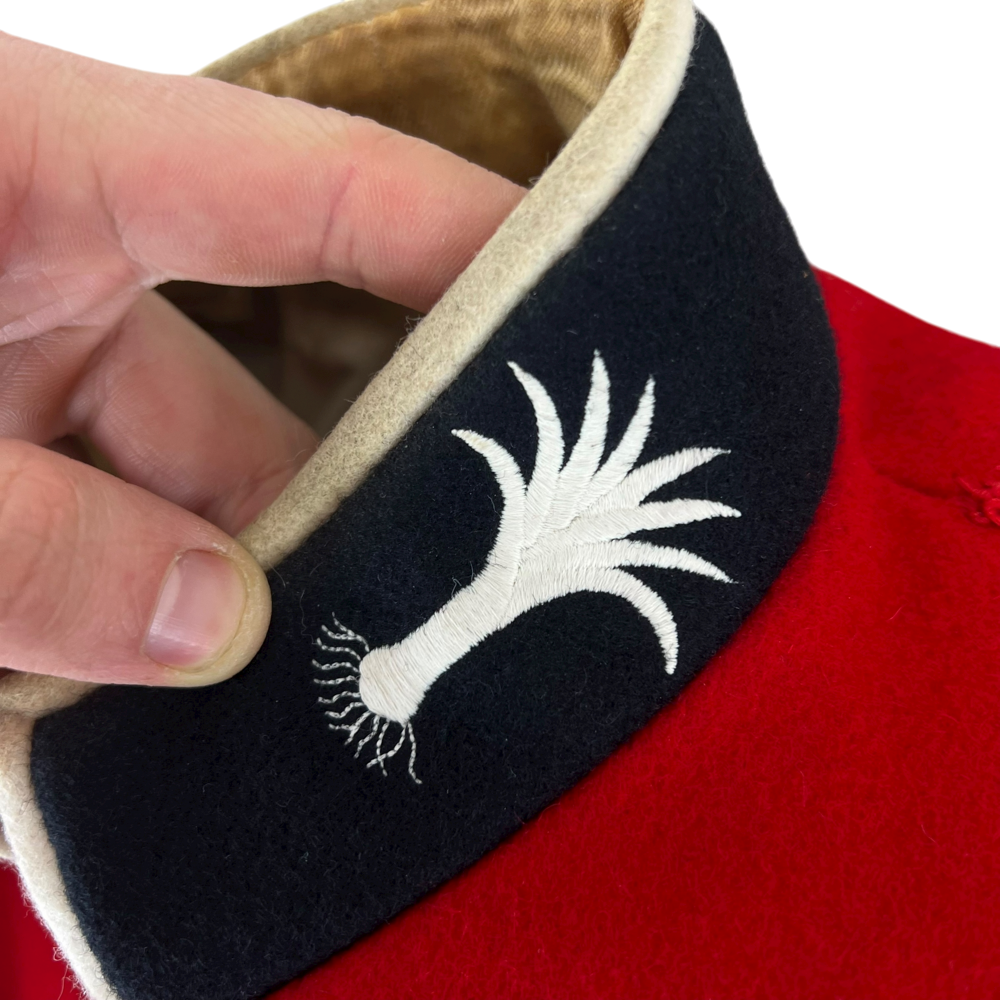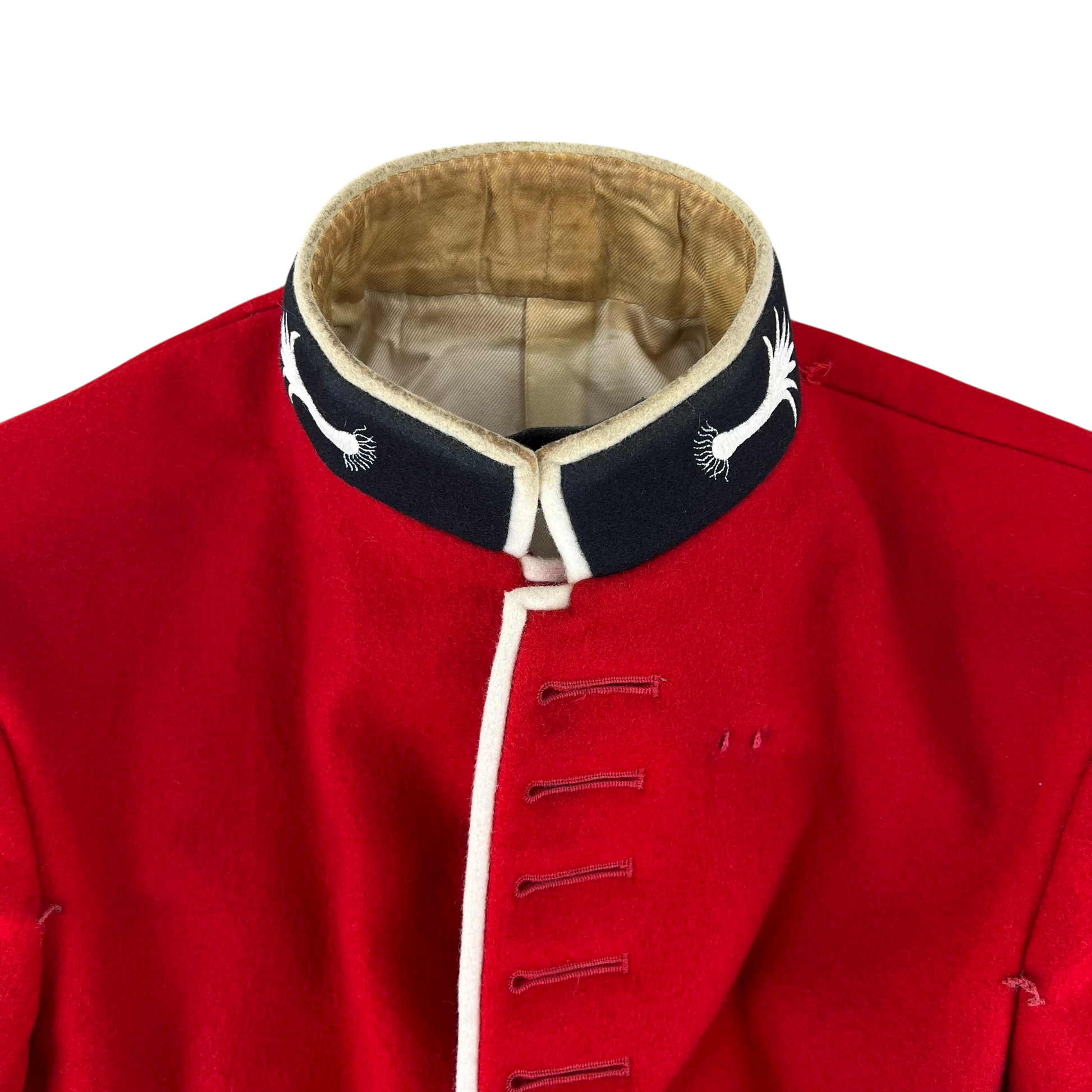 The tunic is quite simplistic with its practical features, but more than makes up for it with its elegance and decor. The whole piece is made of a high quality wool material with a sateen lining, offering comfort and durability. You'll find each hem piped with an off cream edge, which matches beautifully the contrasting black cuffs, shoulder boards and collar. These black sections also include beautiful embroidery, especially on the collar where the regiments iconography is sewn. You'll also notice several engraved "staybrite" buttons which adds yet another level of flair and panache.