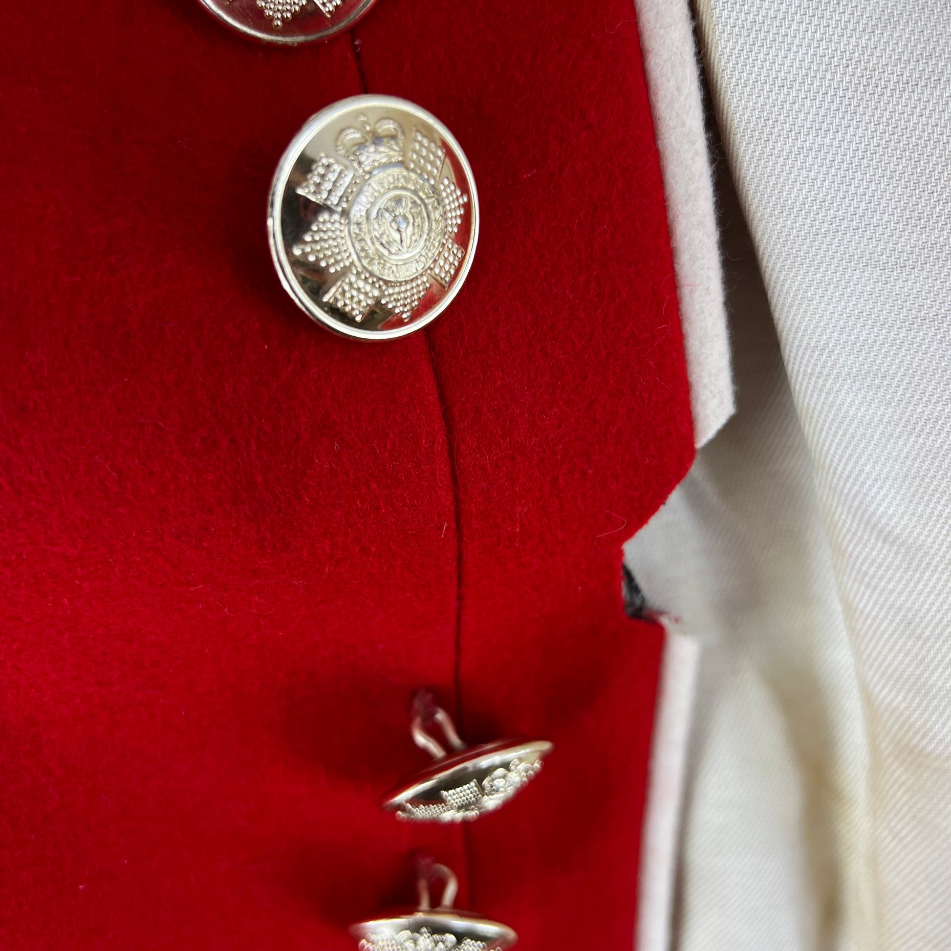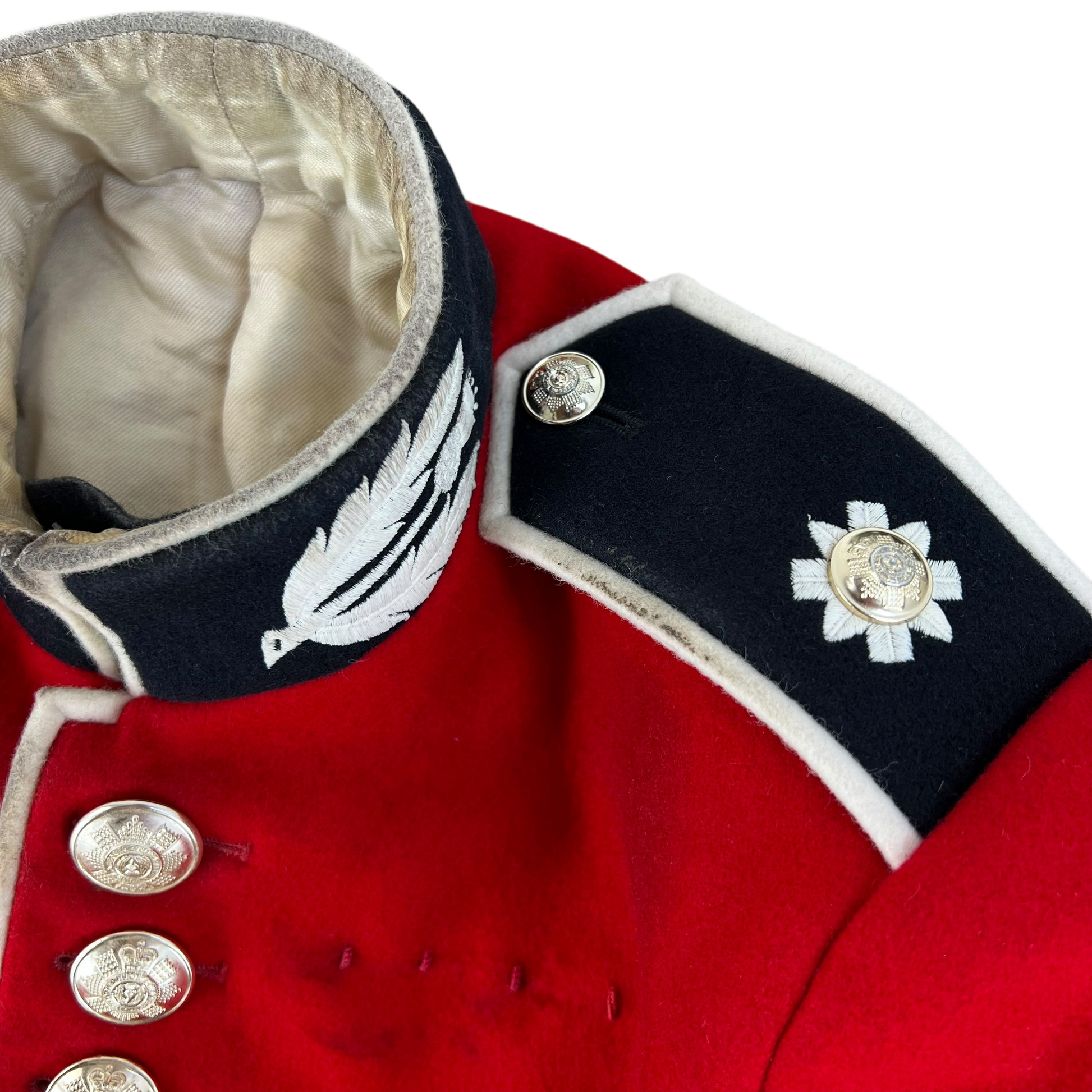The tunic is quite simplistic with its practical features, but more than makes up for it with its elegance and decor. The whole piece is made of a high quality wool material with a sateen lining, offering comfort and durability. You'll find each hem piped with an off cream edge, which matches beautifully the contrasting black cuffs, shoulder boards and collar. These black sections also include beautiful embroidery, especially on the collar where the regiments iconography is sewn. You'll also notice several engraved "staybrite" buttons which adds yet another level of flair and panache.