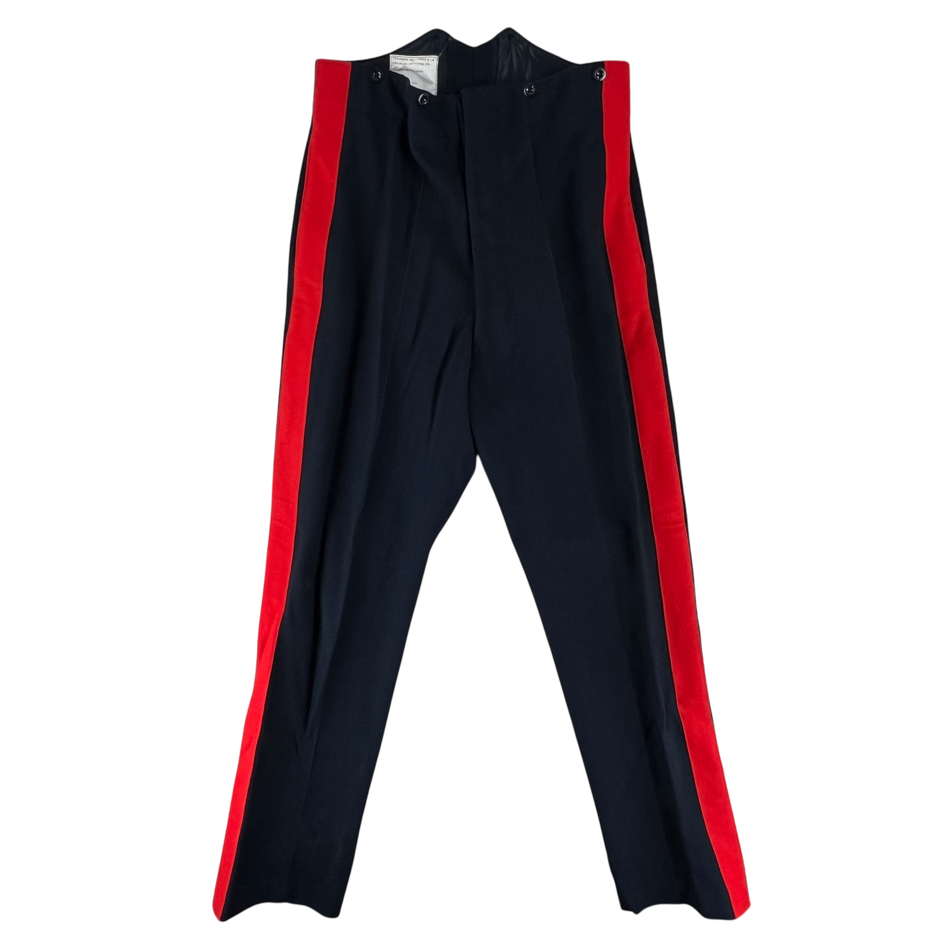 The trousers are beautifully made and feature a wing tipped rear, a button fly and 2 decent sized waist pockets. The cuffs are slightly slanted as is the official style. The scarlet red piping is continuous on both legs. The trousers are designed to be worn with suspenders and as such you'll find several buttons on the inner waist hem. Really a fantastic piece of surplus that carries plenty of heritage just in style alone.
