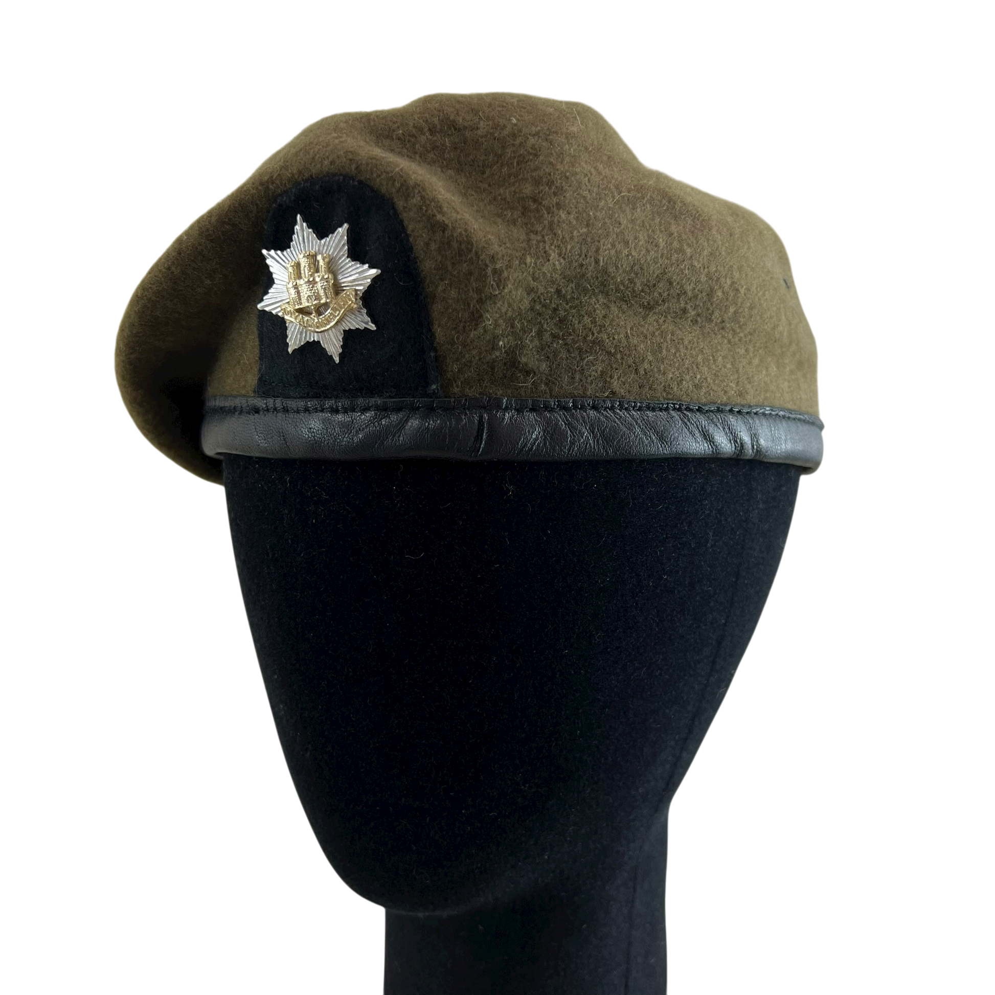 A fantastic piece of modern militaria from the British Army. The all wool material is dyed in a khaki olive colour, subtly contrasted by the black patch with beautiful cap badge fixed above. The cap is hemmed with genuine leather. An excellent piece of militaria for a collector.