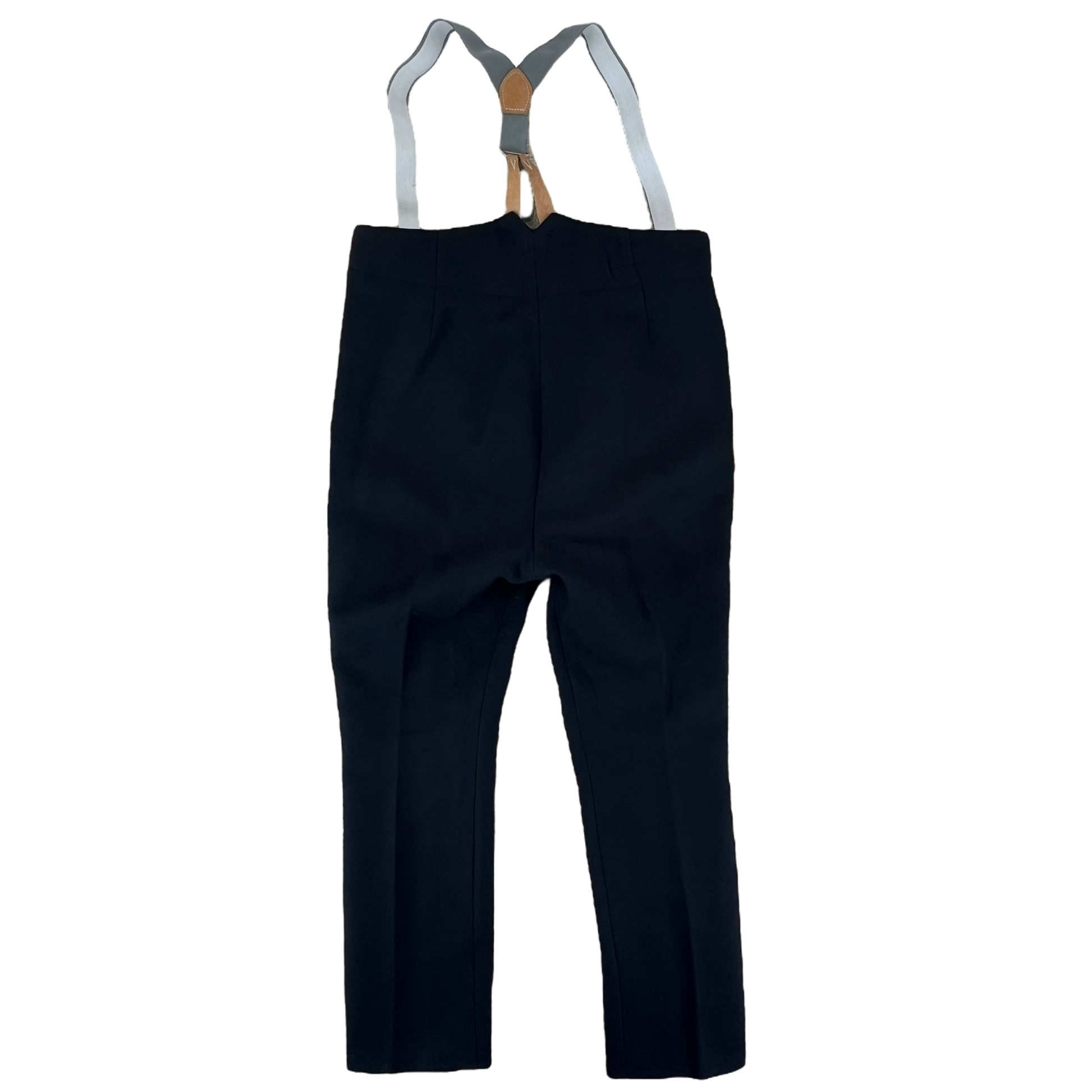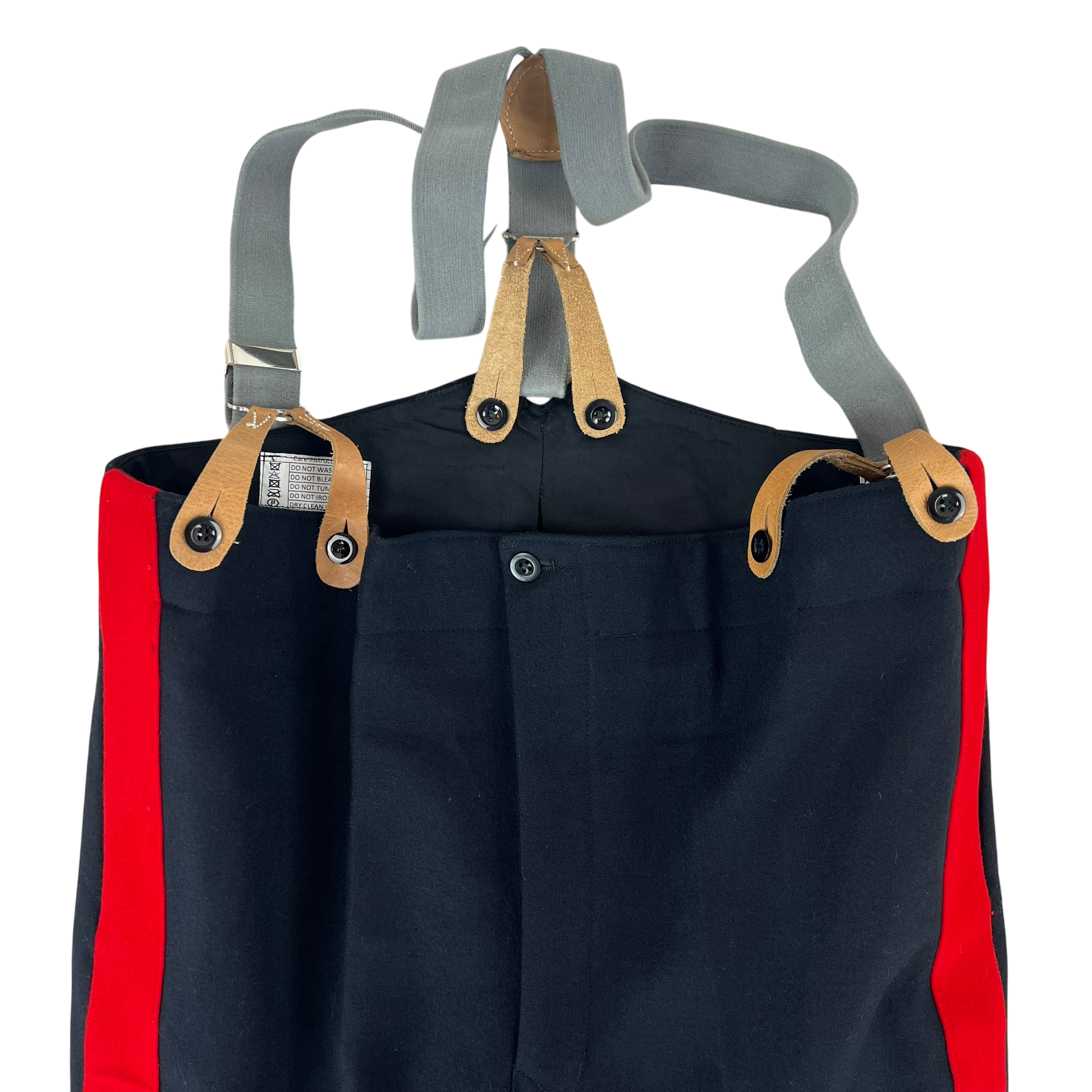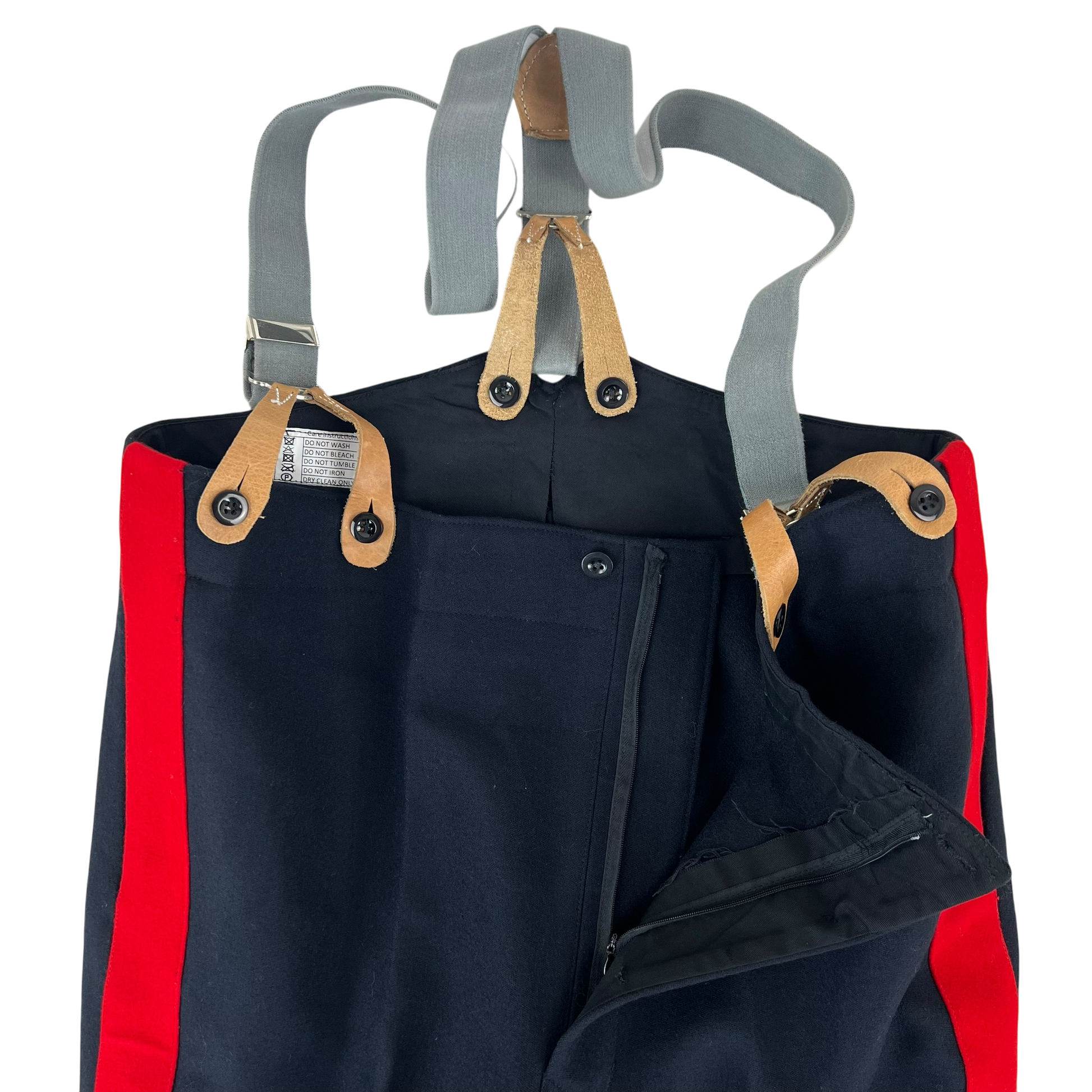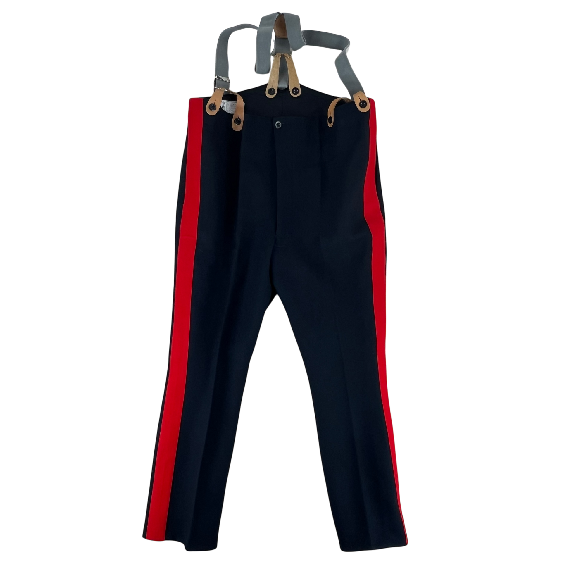 The trousers are beautifully made and feature a wing tipped rear, a zipper fly and 2 decent sized waist pockets. The cuffs are slightly slanted as is the official style. The scarlet red piping is continuous on both legs. The trousers are designed to be worn with suspenders and as such you'll find several buttons on the inner waist hem. Really a fantastic piece of surplus that carries plenty of heritage just in style alone.