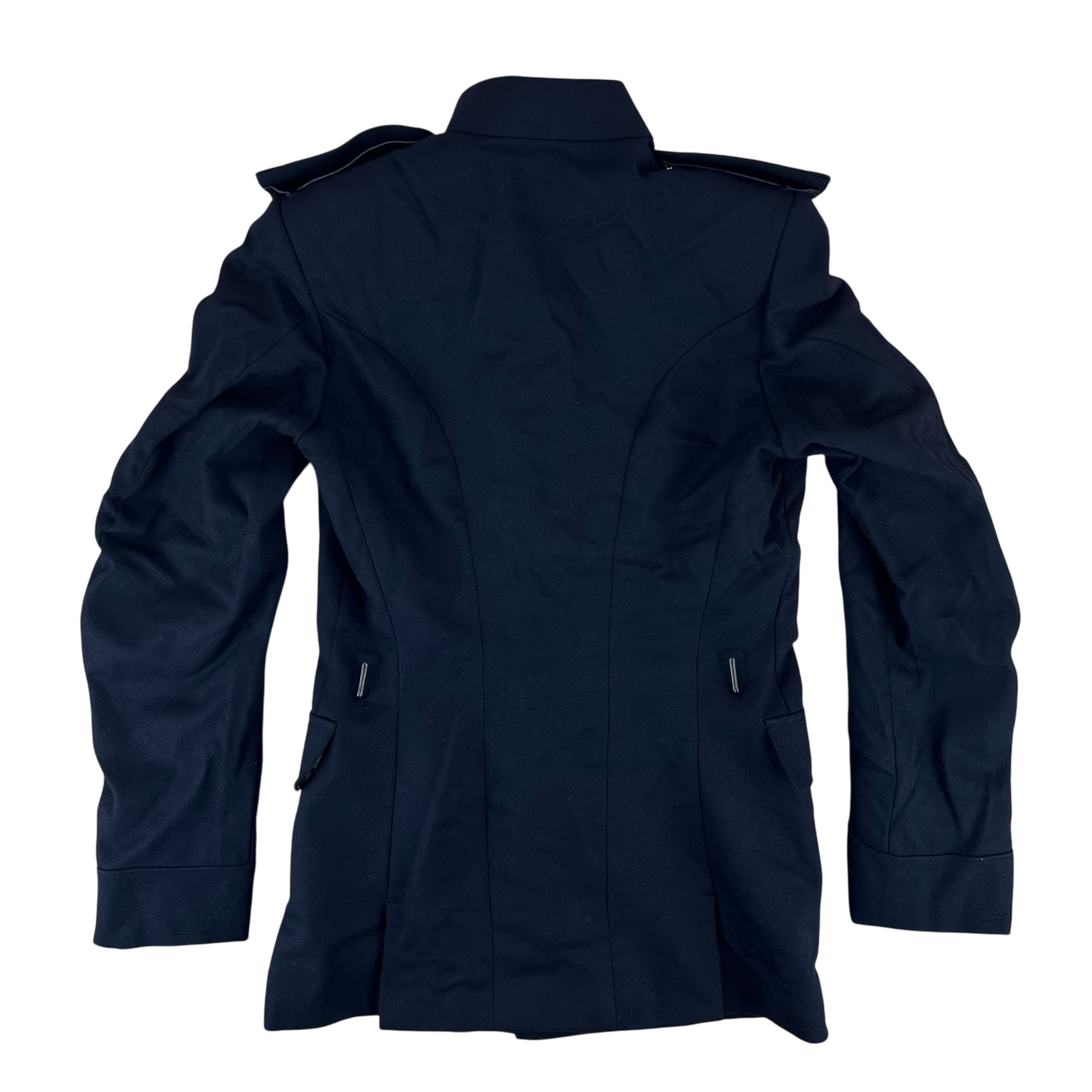 For features, it is quite a simple jacket, made from 100% wool. There's 4 pockets in total, 2 flap and 2 buttonable flap pockets, arranged in the typical "safari" style, with 2 on the hips and 2 on the chest. The collar is mandarin style, being closed with 2 hook & eyes. On the shoulders you'll find shoulder epaulettes, usually designed to secure ribbons and other sashes during ceremonial events. For the colour, it is a very dark navy blue, bordering on black.