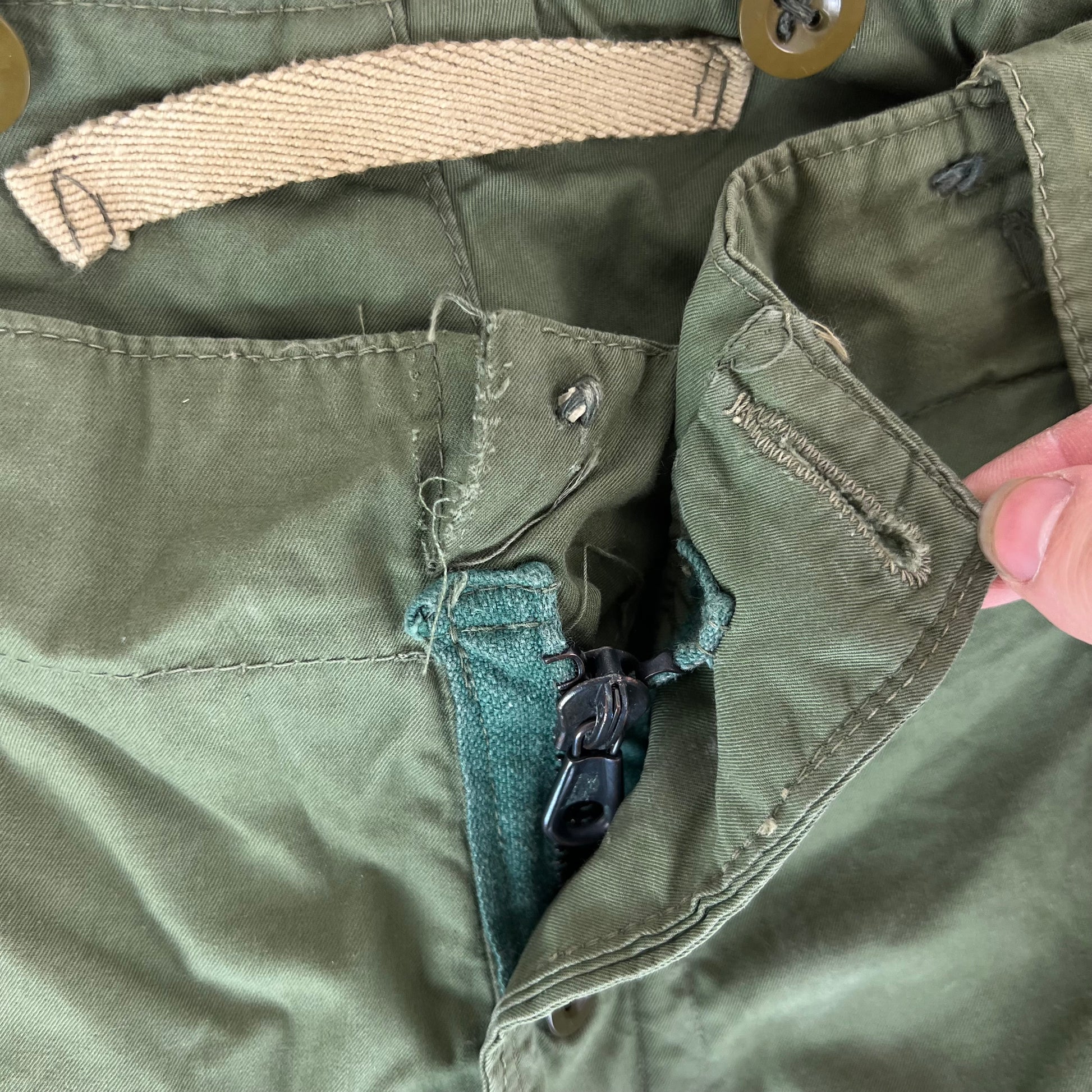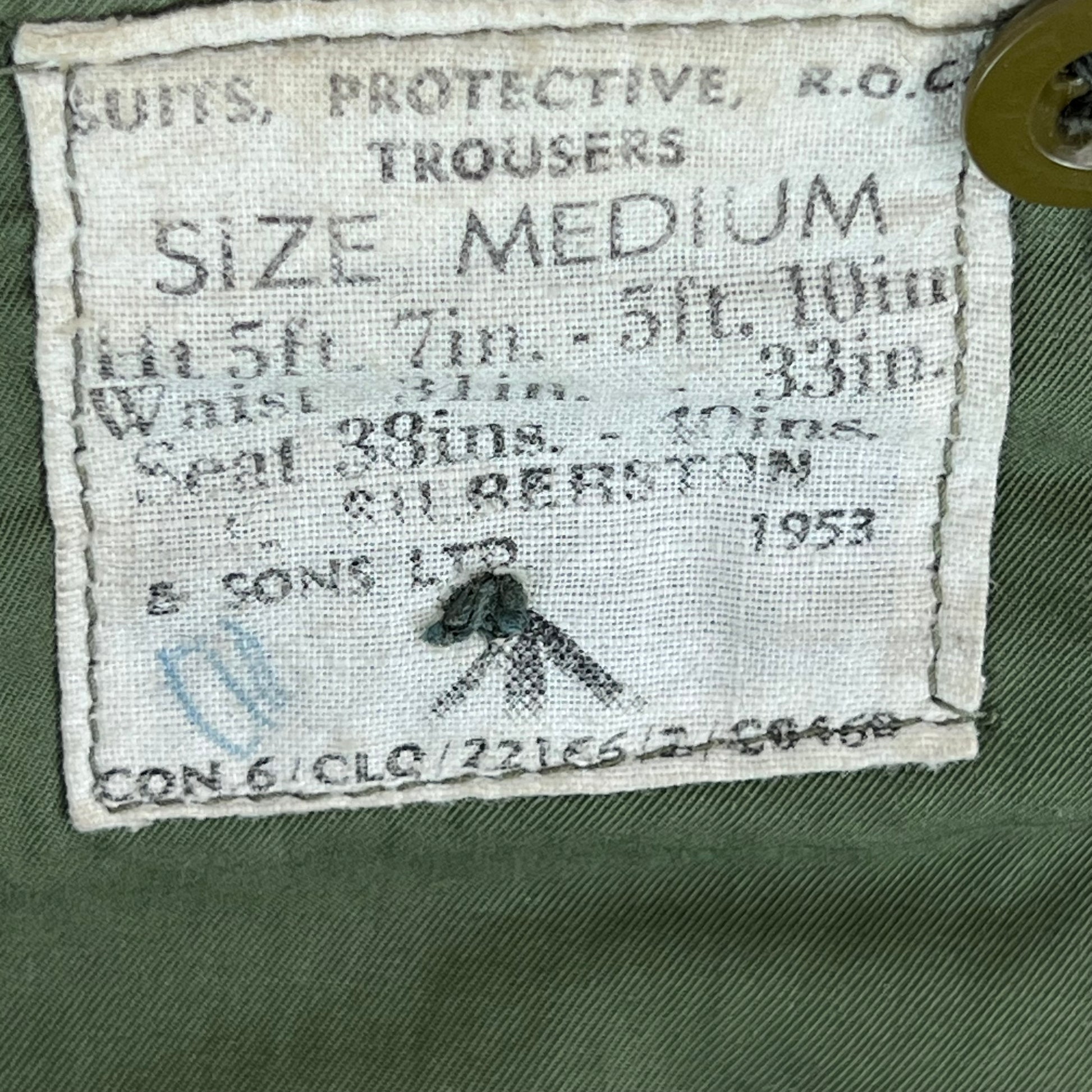 A great unusual piece of vintage militaria from a few years after the Second World War. Issued to members of the Royal Observer Corps, this particular pair belonged to a gentleman from West Wales who served in France and Germany during the war. These fantastic trousers are made of an all gabardine material, a lovely quality and durable material. The ROC, although a relatively small branch of the British Forces were absolutely essential during the War and the Cold War thereafter. As such the ROC styled their new protective suits after the 1951 Combat Suit model, using the same material and a pretty similar cut. The ROC protective suit is not to be confused with NBC protective suits. It comes with plenty of pockets, some nice 2" belt loops and a zipper and button closure fly. The history around these niche suits, which were only ever made in a few thousand, and the people who wore them is always a wonderful read.