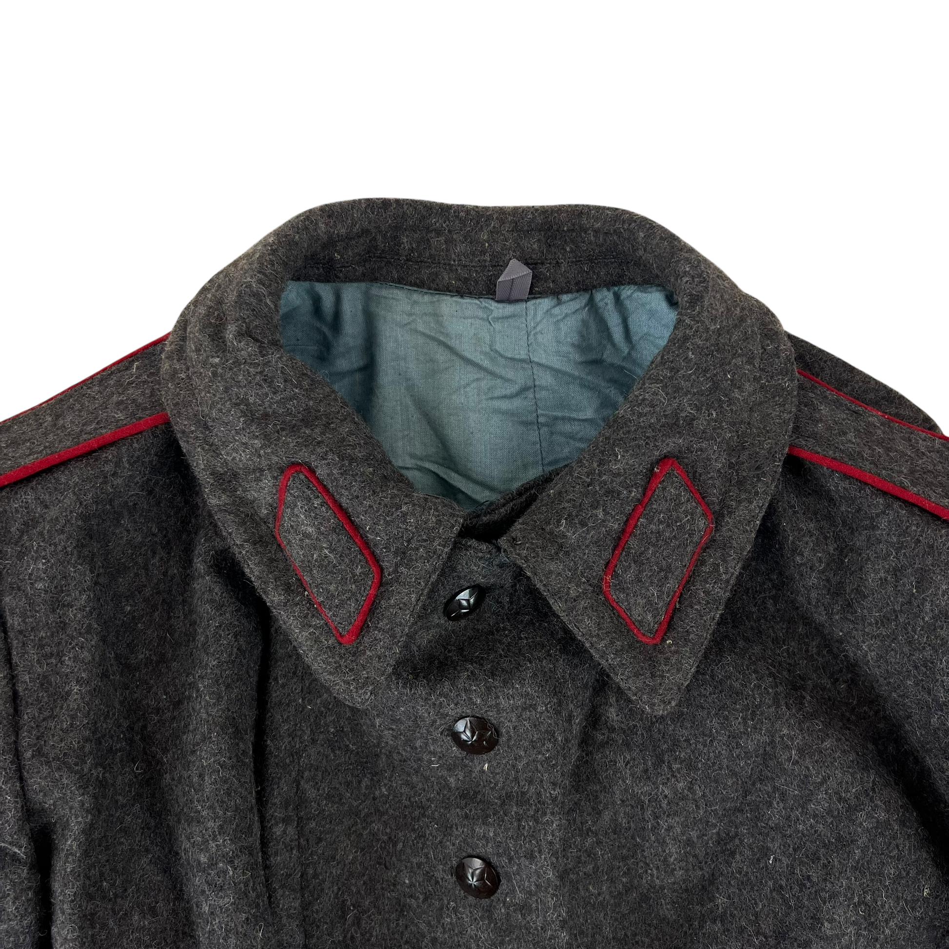 A beautiful woollen piece from a bygone era of Bulgaria. Issued for decades with the original inspiration relying heavily on the early Soviet models, the coat saw some tweaks over the nearly 50 that the communist government lasted, although they always stayed true to the Russian origin. The coat is made of an all wool material, giving great windproofing and water resistance. It features some lovely engraved buttons too, featuring a red star.