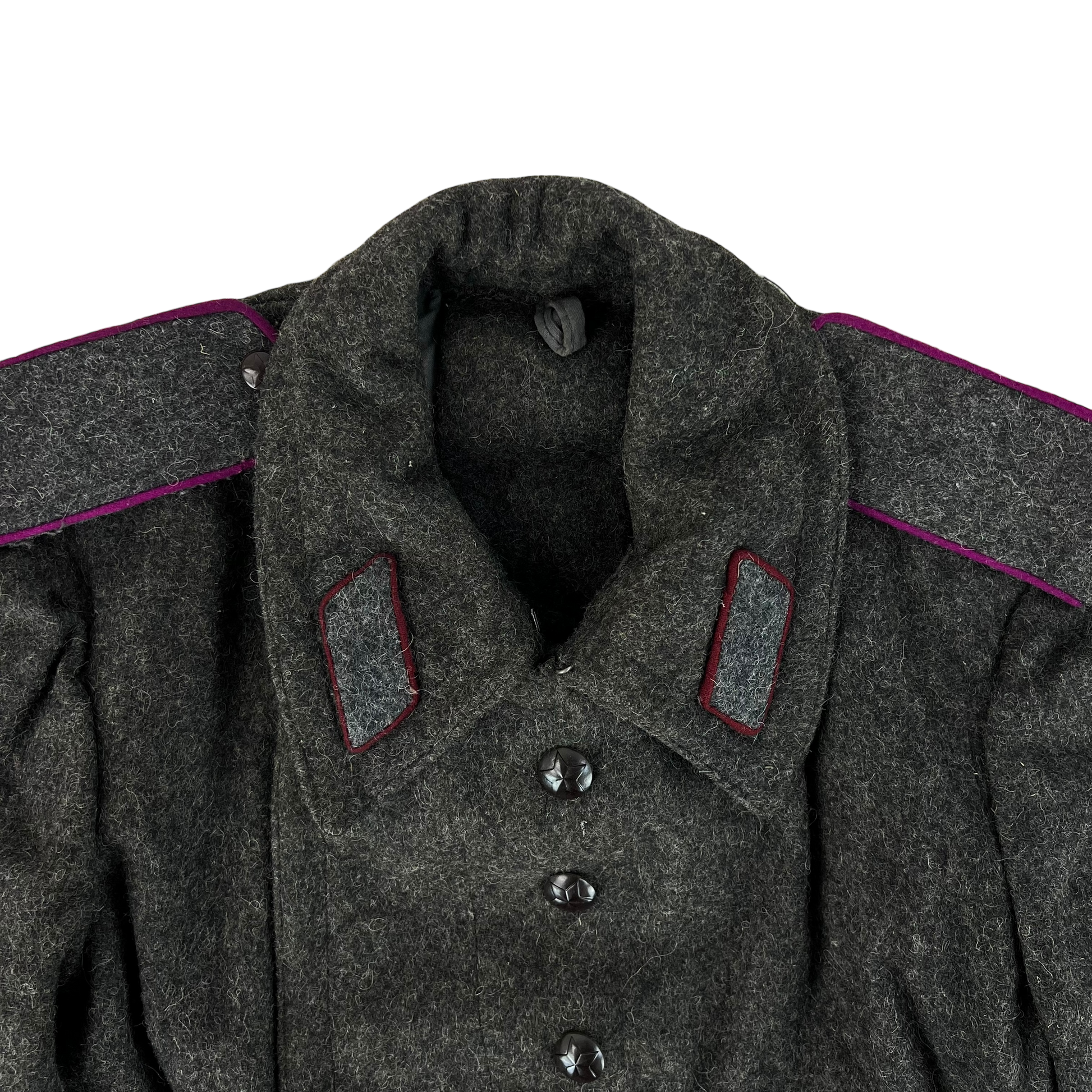 A beautiful woollen piece from a bygone era of Bulgaria. Issued for decades with the original inspiration relying heavily on the early Soviet models, the coat saw some tweaks over the nearly 50 that the communist government lasted, although they always stayed true to the Russian origin. The coat is made of an all wool material, giving great windproofing and water resistance. It features some lovely engraved buttons too, featuring a red star.