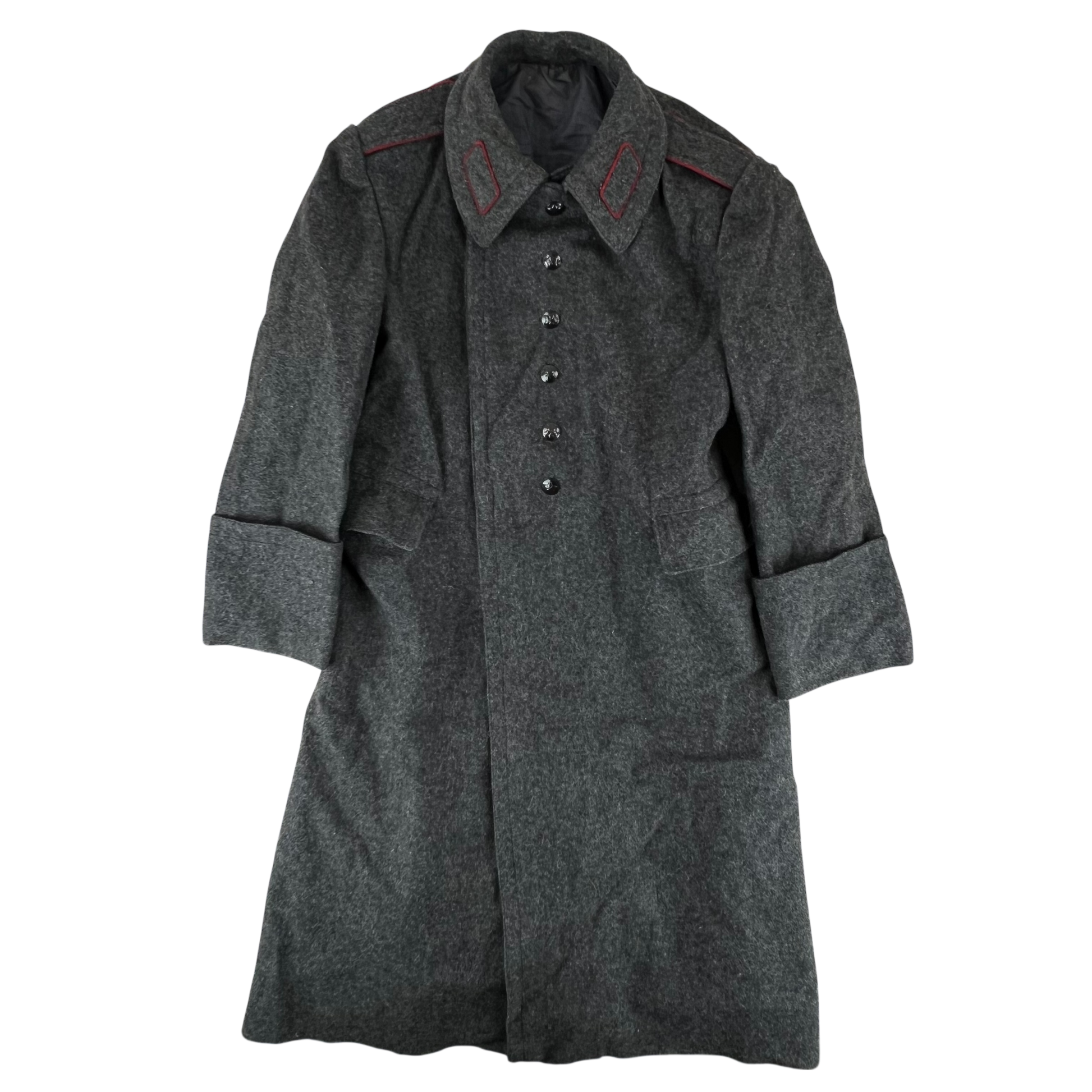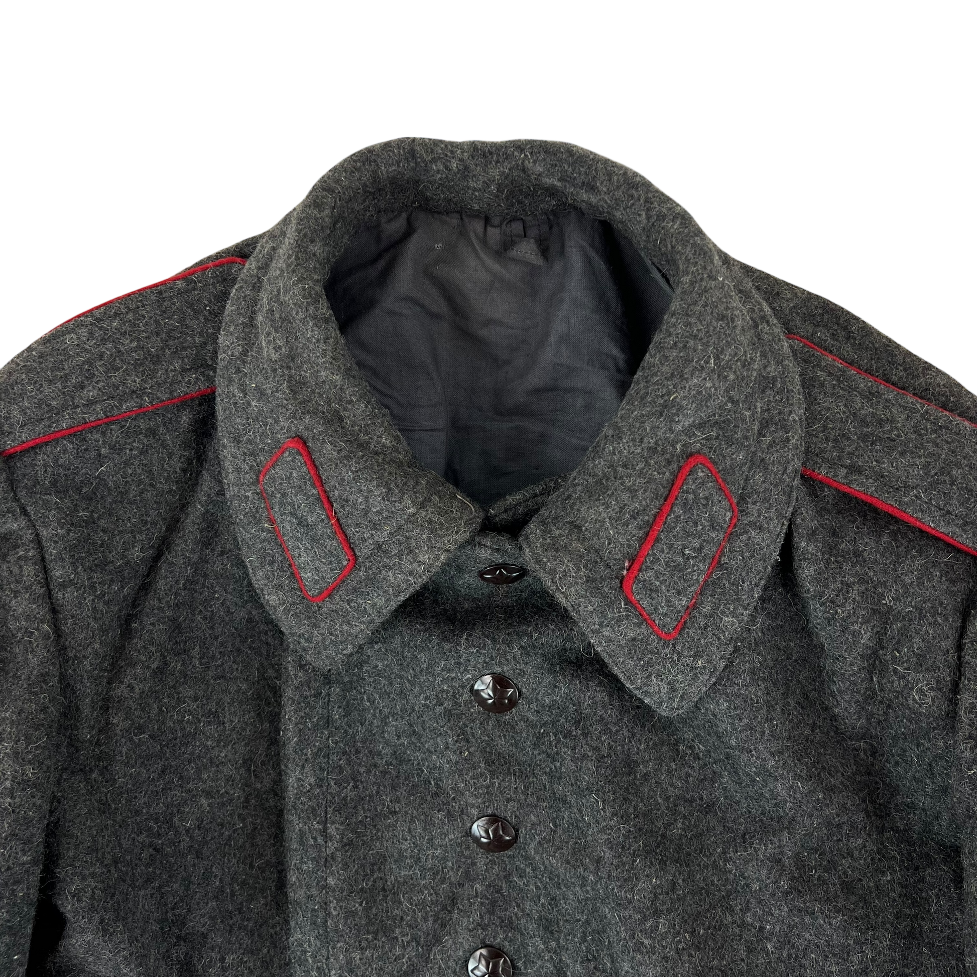 A beautiful woollen piece from a bygone era of Bulgaria. Issued for decades with the original inspiration relying heavily on the early Soviet models, the coat saw some tweaks over the nearly 50 that the communist government lasted, although they always stayed true to the Russian origin. The coat is made of an all wool material, giving great windproofing and water resistance. It features some lovely engraved buttons too, featuring a red star.