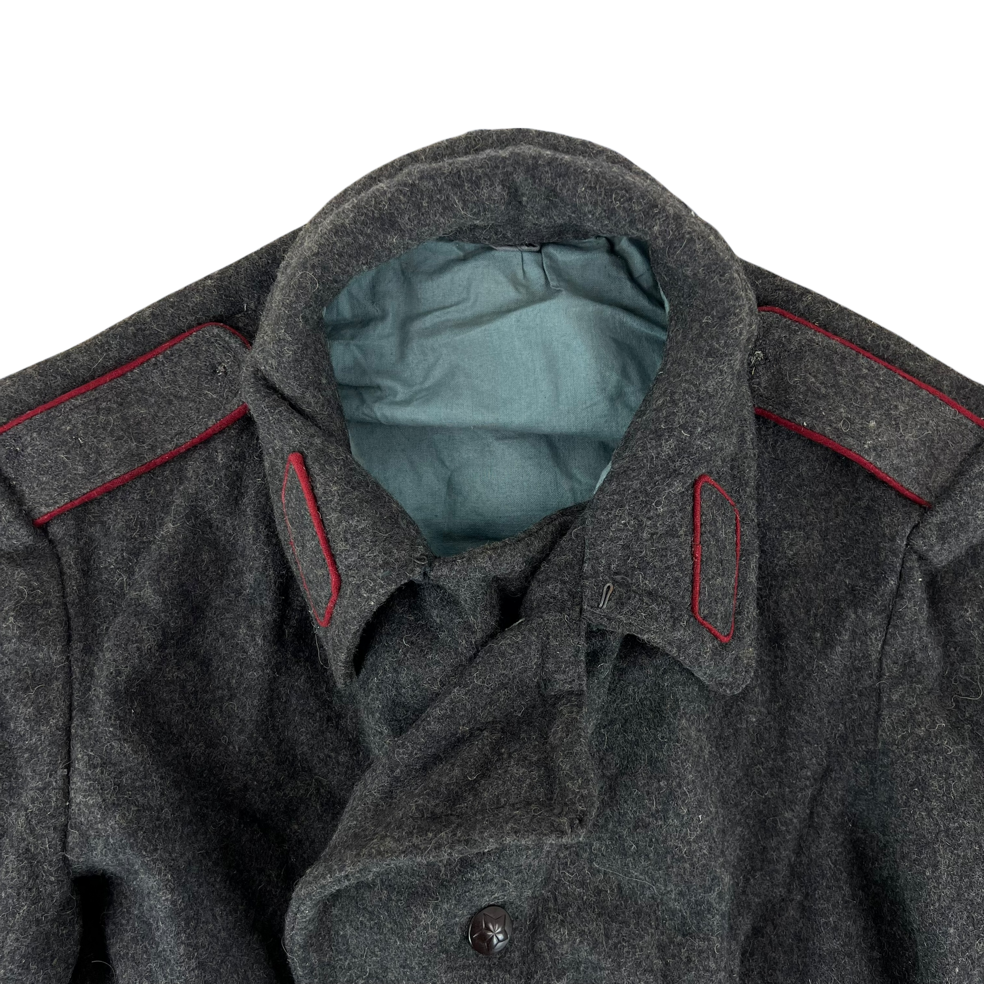 A beautiful woollen piece from a bygone era of Bulgaria. Issued for decades with the original inspiration relying heavily on the early Soviet models, the coat saw some tweaks over the nearly 50 that the communist government lasted, although they always stayed true to the Russian origin. The coat is made of an all wool material, giving great windproofing and water resistance. It features some lovely engraved buttons too, featuring a red star.