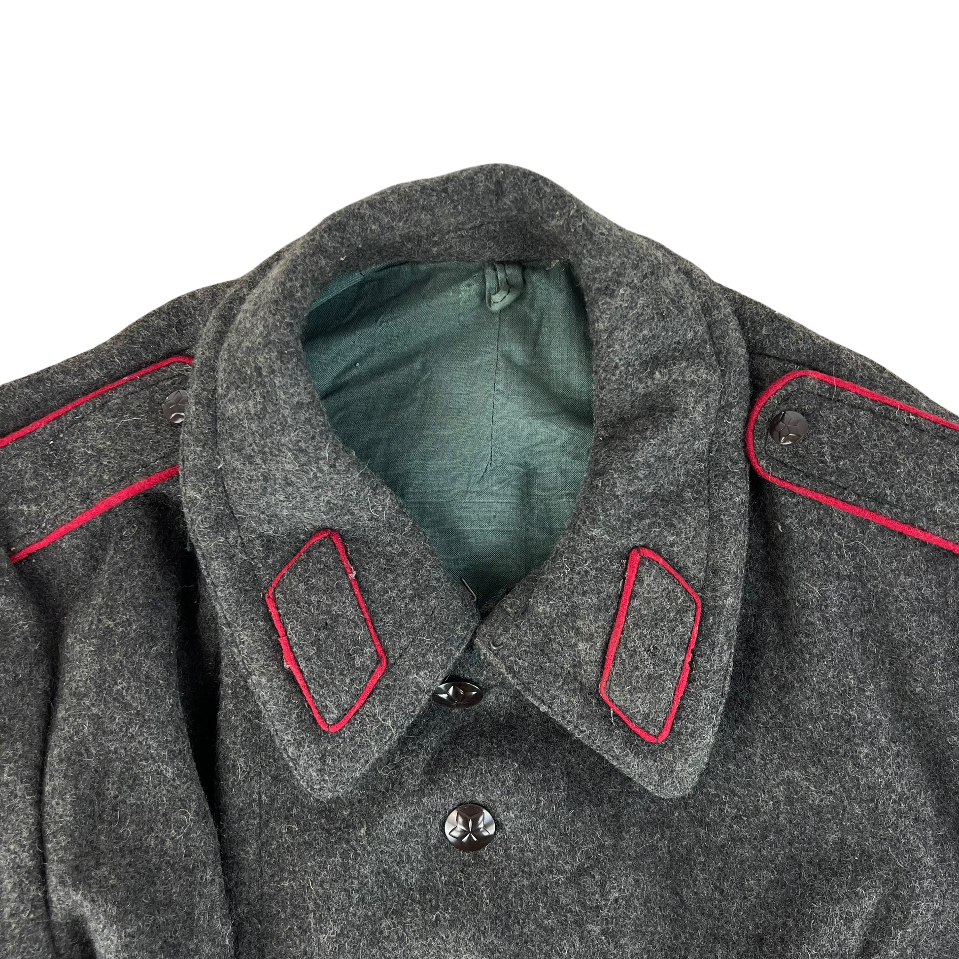 A beautiful woollen piece from a bygone era of Bulgaria. Issued for decades with the original inspiration relying heavily on the early Soviet models, the coat saw some tweaks over the nearly 50 that the communist government lasted, although they always stayed true to the Russian origin. The coat is made of an all wool material, giving great windproofing and water resistance. It features some lovely engraved buttons too, featuring a red star.