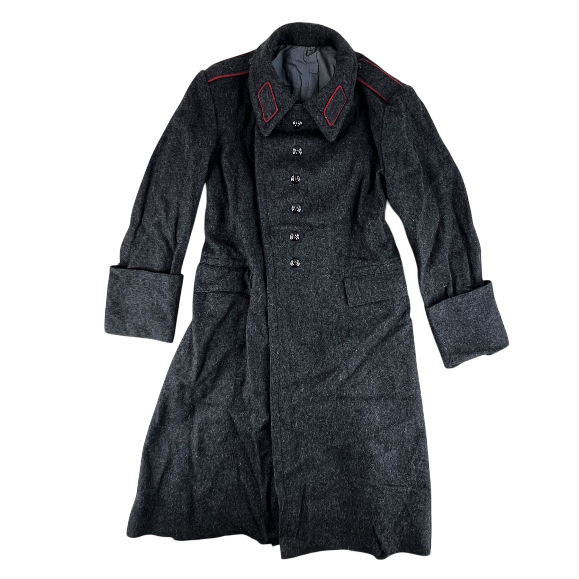 A beautiful woollen piece from a bygone era of Bulgaria. Issued for decades with the original inspiration relying heavily on the early Soviet models, the coat saw some tweaks over the nearly 50 that the communist government lasted, although they always stayed true to the Russian origin. The coat is made of an all wool material, giving great windproofing and water resistance. It features some lovely engraved buttons too, featuring a red star.