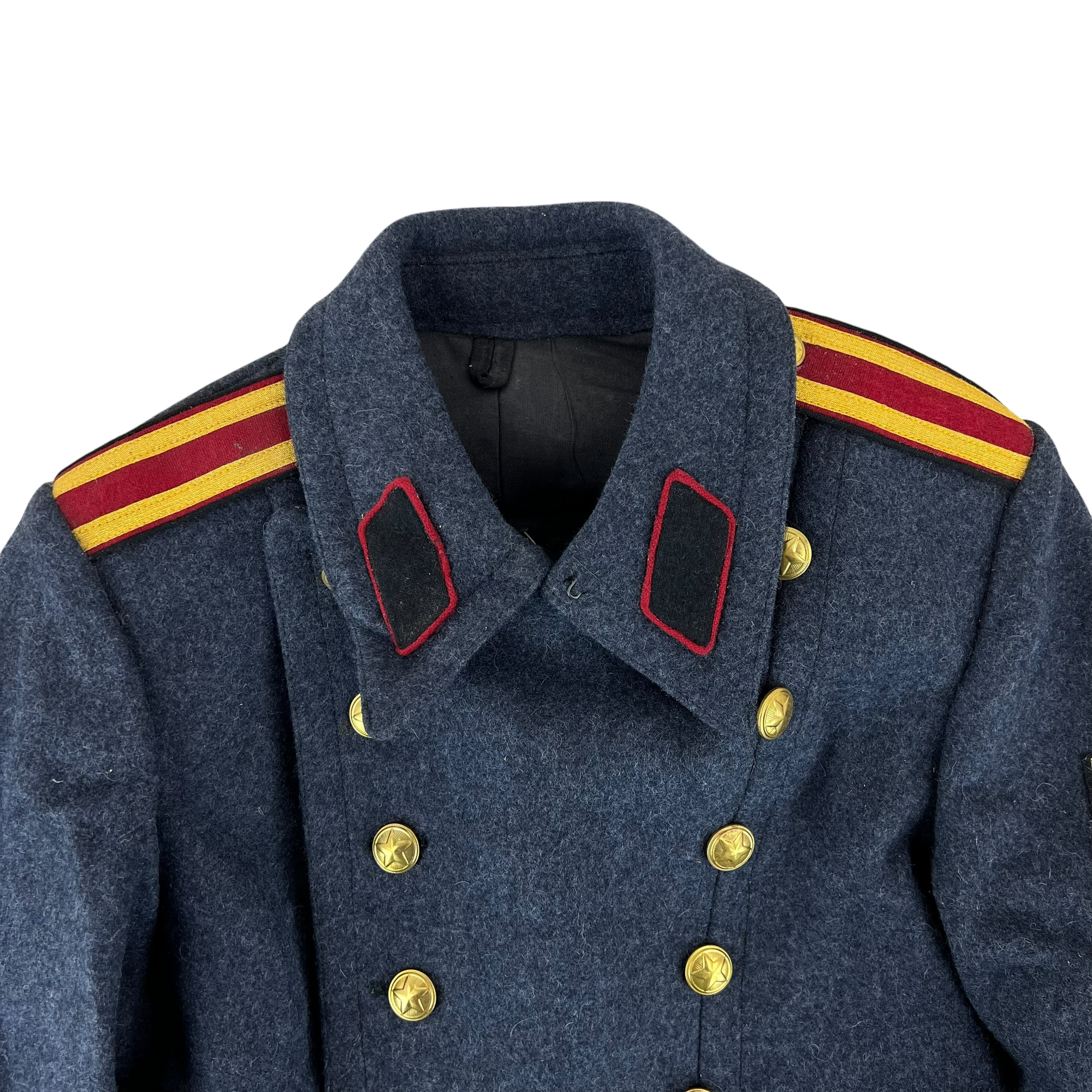 A beautiful woollen piece from a bygone era of Bulgaria. Issued for decades with the original inspiration relying heavily on the early Soviet models, the coat saw some tweaks over the nearly 50 that the communist government lasted, although they always stayed true to the Russian origin. The coat is made of an all wool material, giving great windproofing and water resistance. It features some lovely engraved buttons too, featuring a red star.