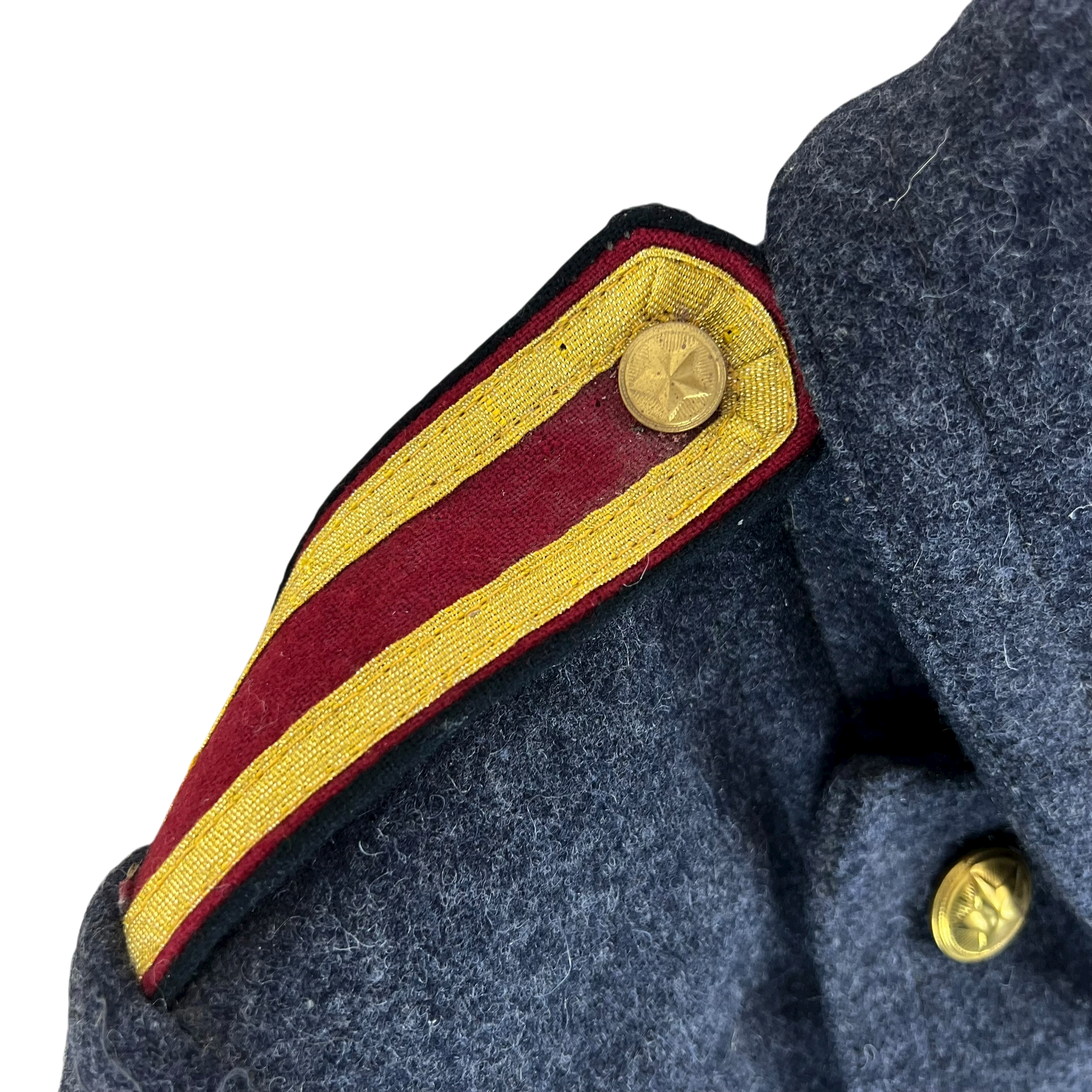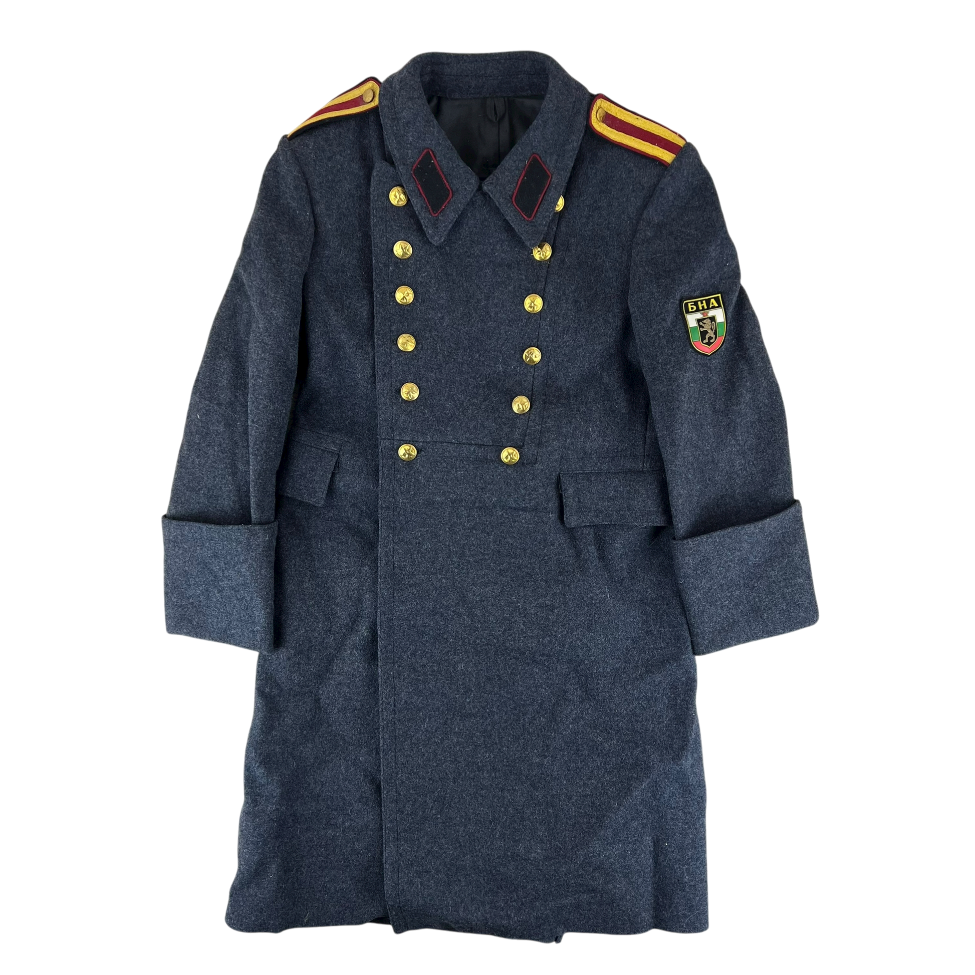 A beautiful woollen piece from a bygone era of Bulgaria. Issued for decades with the original inspiration relying heavily on the early Soviet models, the coat saw some tweaks over the nearly 50 that the communist government lasted, although they always stayed true to the Russian origin. The coat is made of an all wool material, giving great windproofing and water resistance. It features some lovely engraved buttons too, featuring a red star.