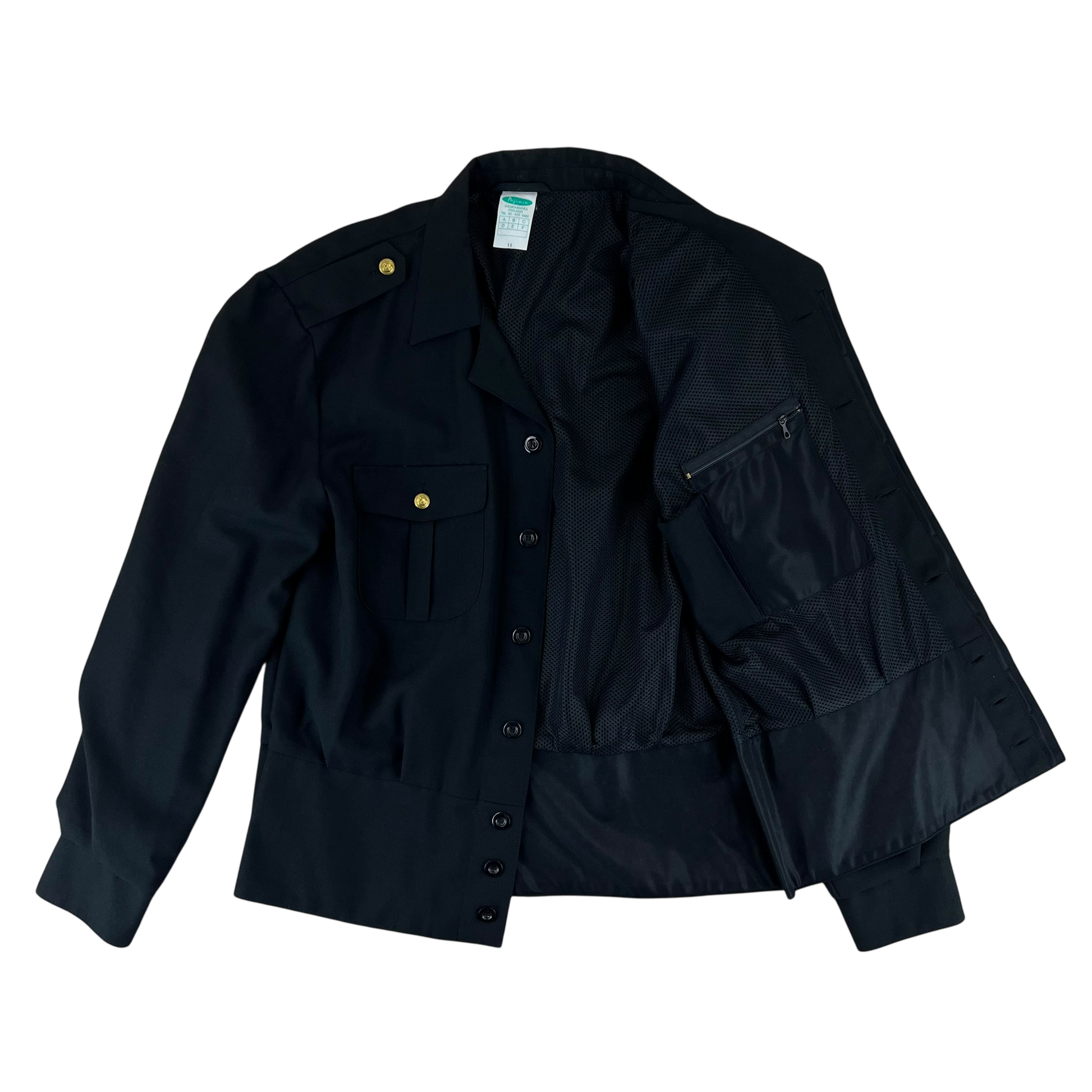 The jacket comes with wonderful engraved golden anchor buttons and a quaint Finnish flag patch on the sleeve. You'll find 2 flap pockets, internal pockets as well as a slit chest pocket offering ample storage for a dress piece!