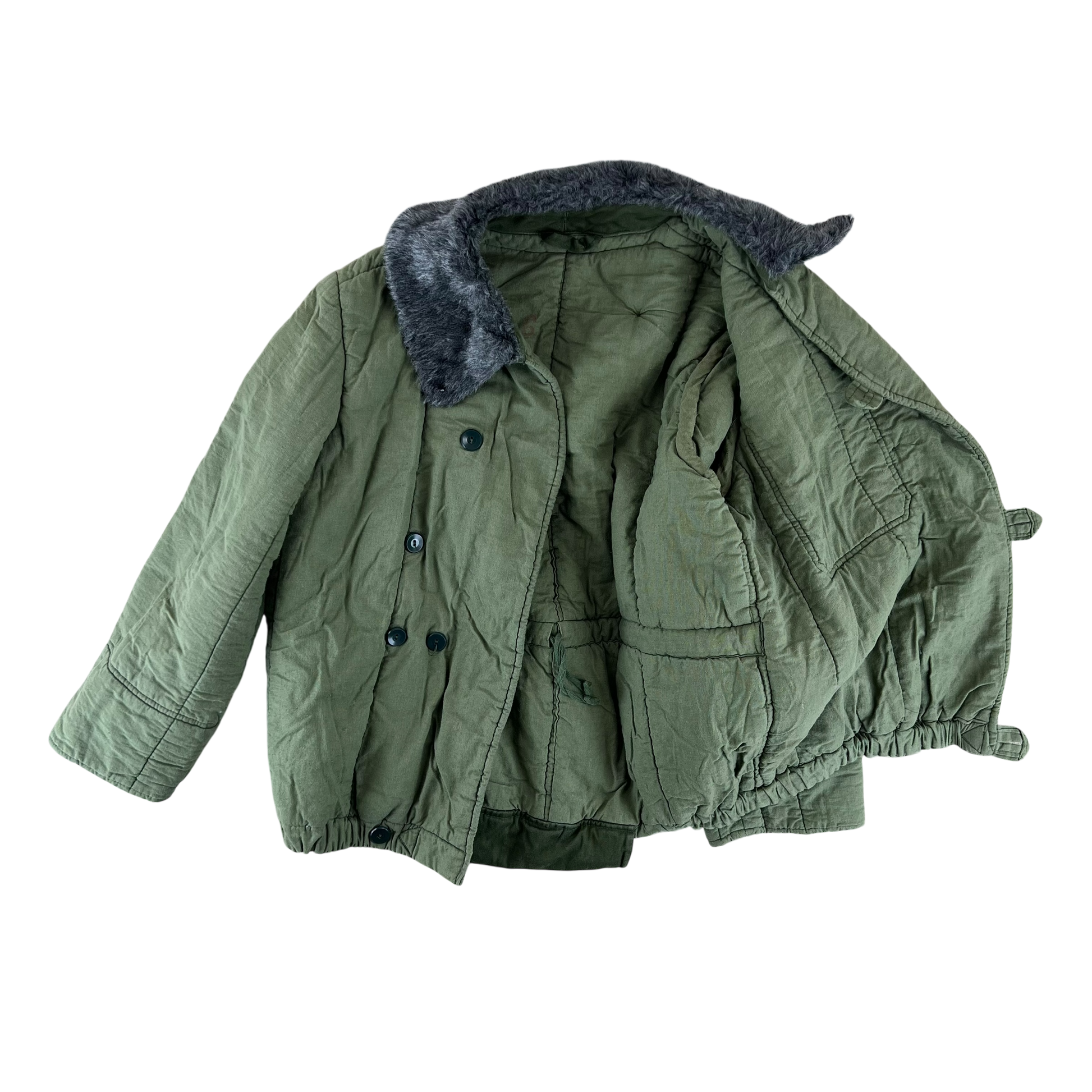The liner is incredibly warming, designed to last the harsh and bitter winters of Eastern Europe. It is made of durable cotton shell with a thick and insulating wool blend lining. The piece is of course designed to be worn under the correlating parka but in all honesty it provides plenty by itself. It has a wonderful faux fur collar, a slit pocket and an internal drawstring across the waist which, along with the elasticated cuffs, provide fantastic insulation during harsh weather. A great piece of Cold War kit, that is sure to keep you cozy whatever your adventure.