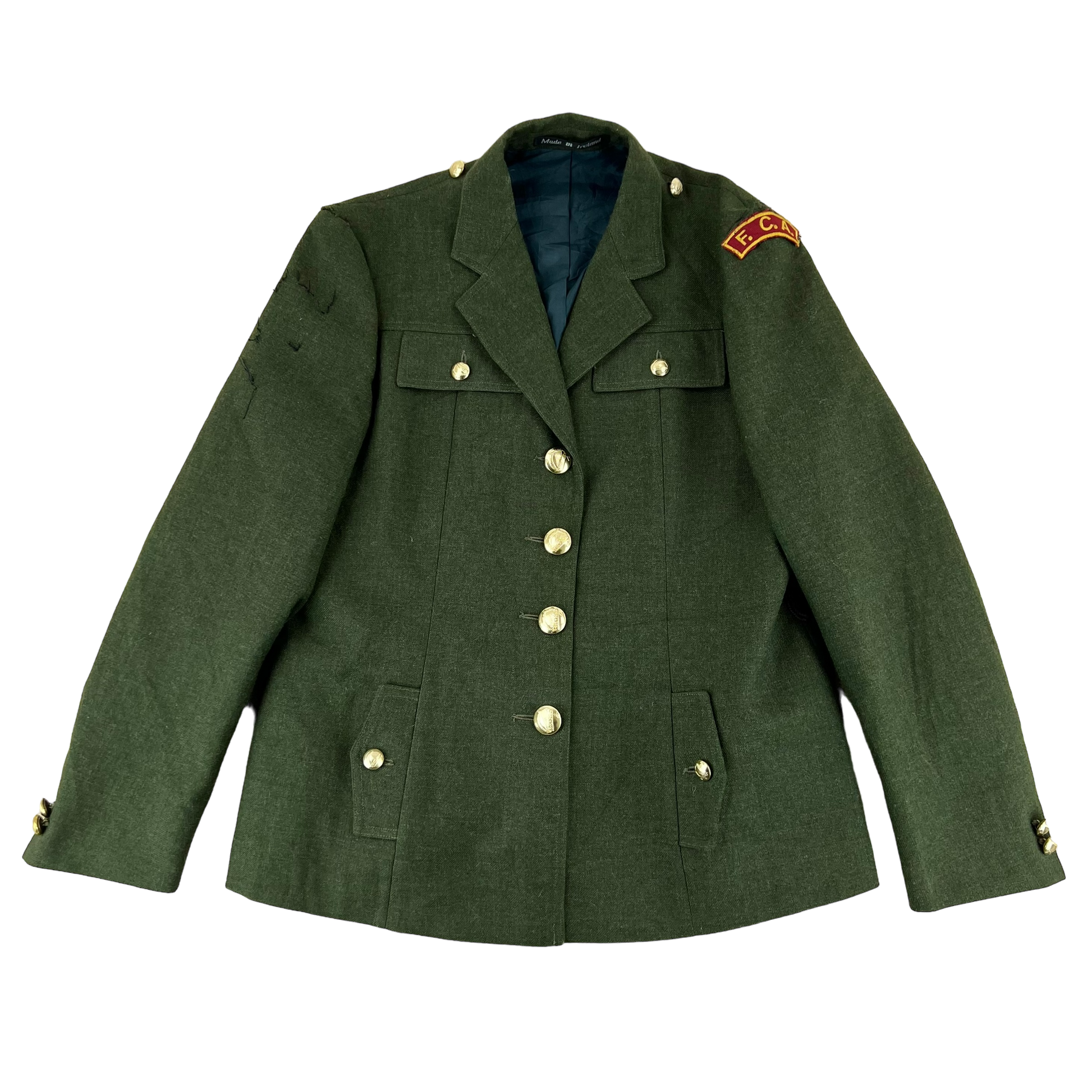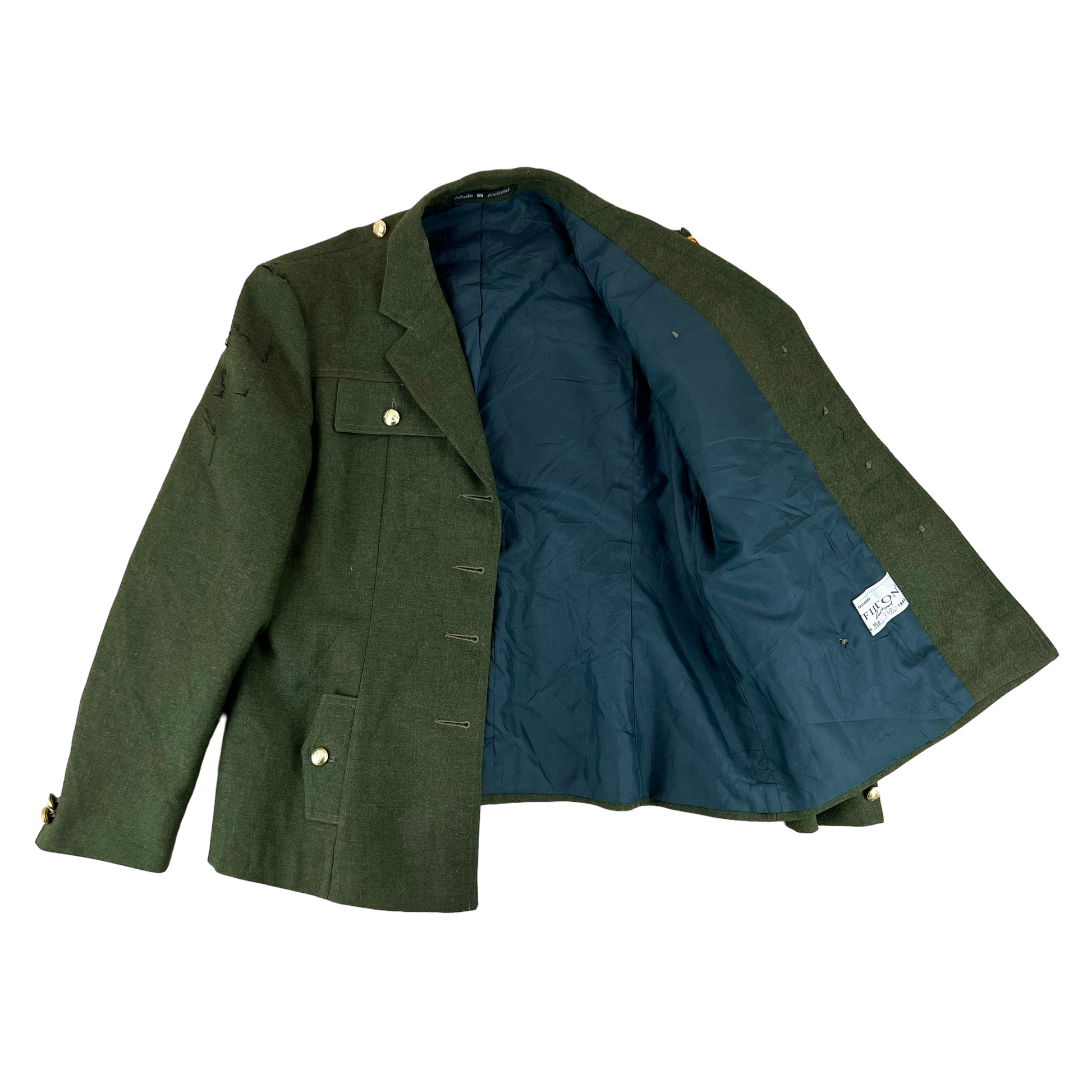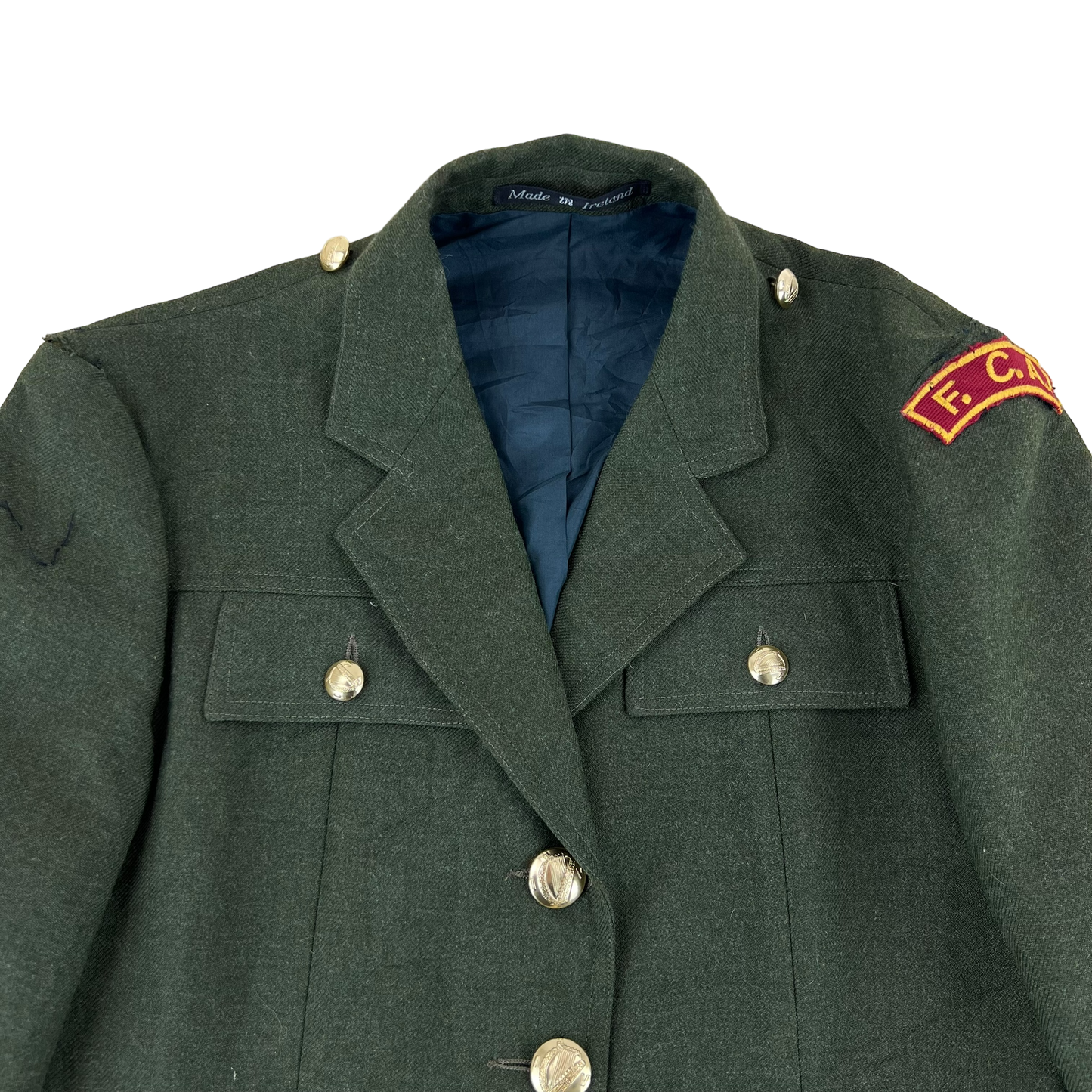 Vintage surplus, issued in 1994. Made from quality wool, the jacket is very durable and has a polyester lining. These jackets are used primarily for ceremonies and parade events. The jacket is from the "Fórsa Cosanta Áitiúil" or Local Defence Force, an Irish army component dating back as early as the 1920's.