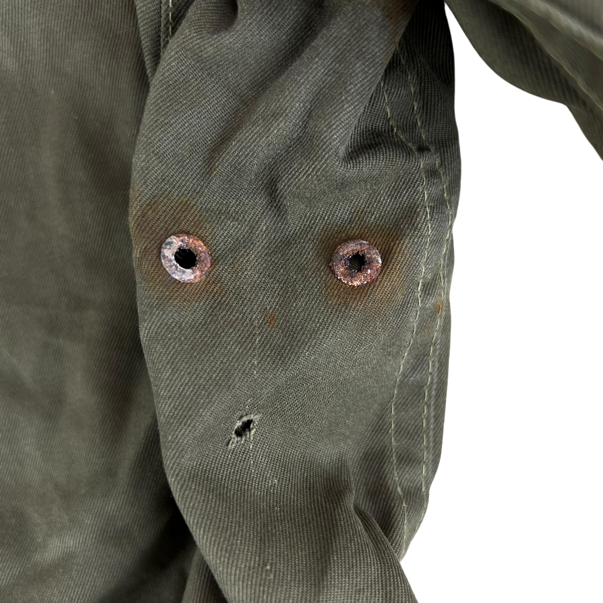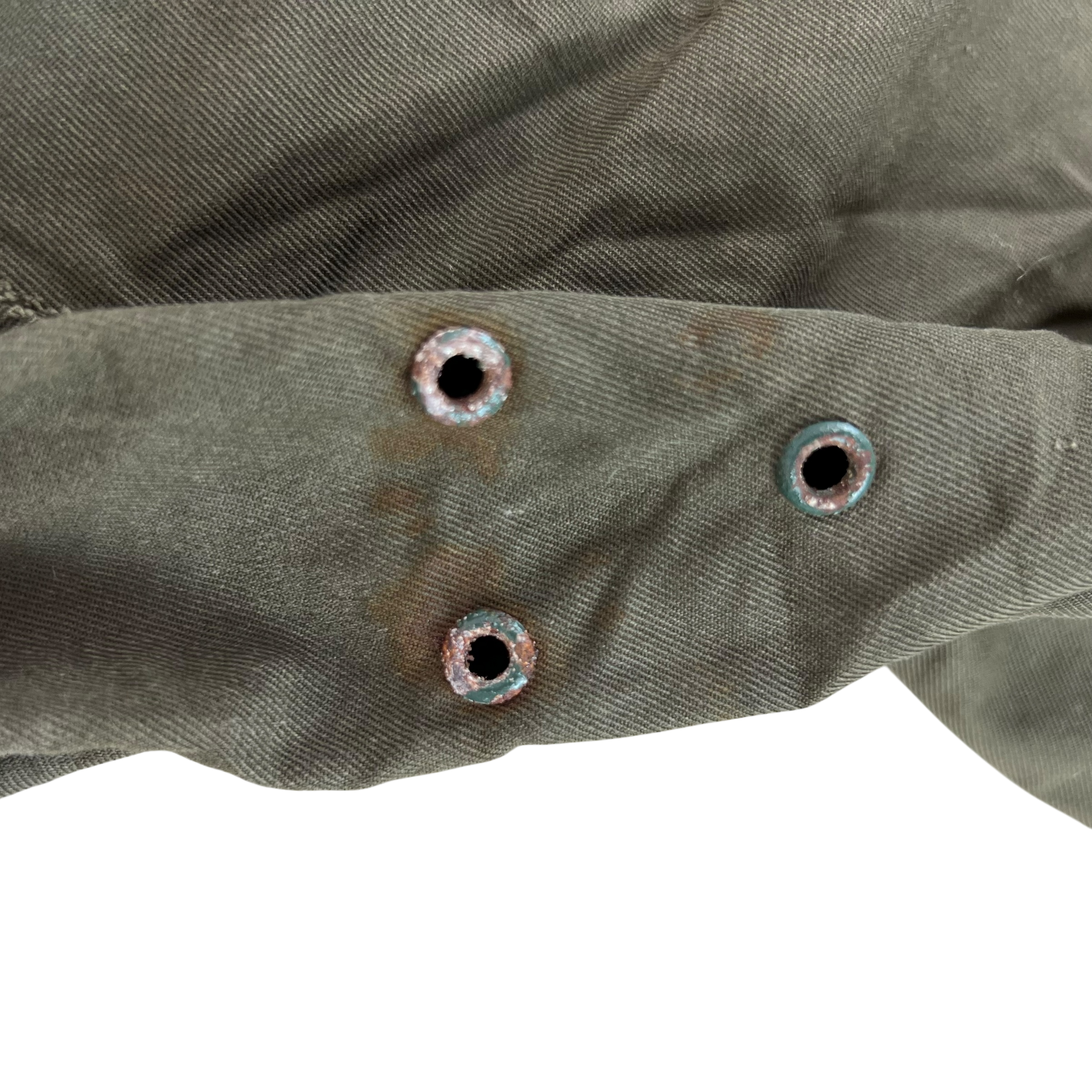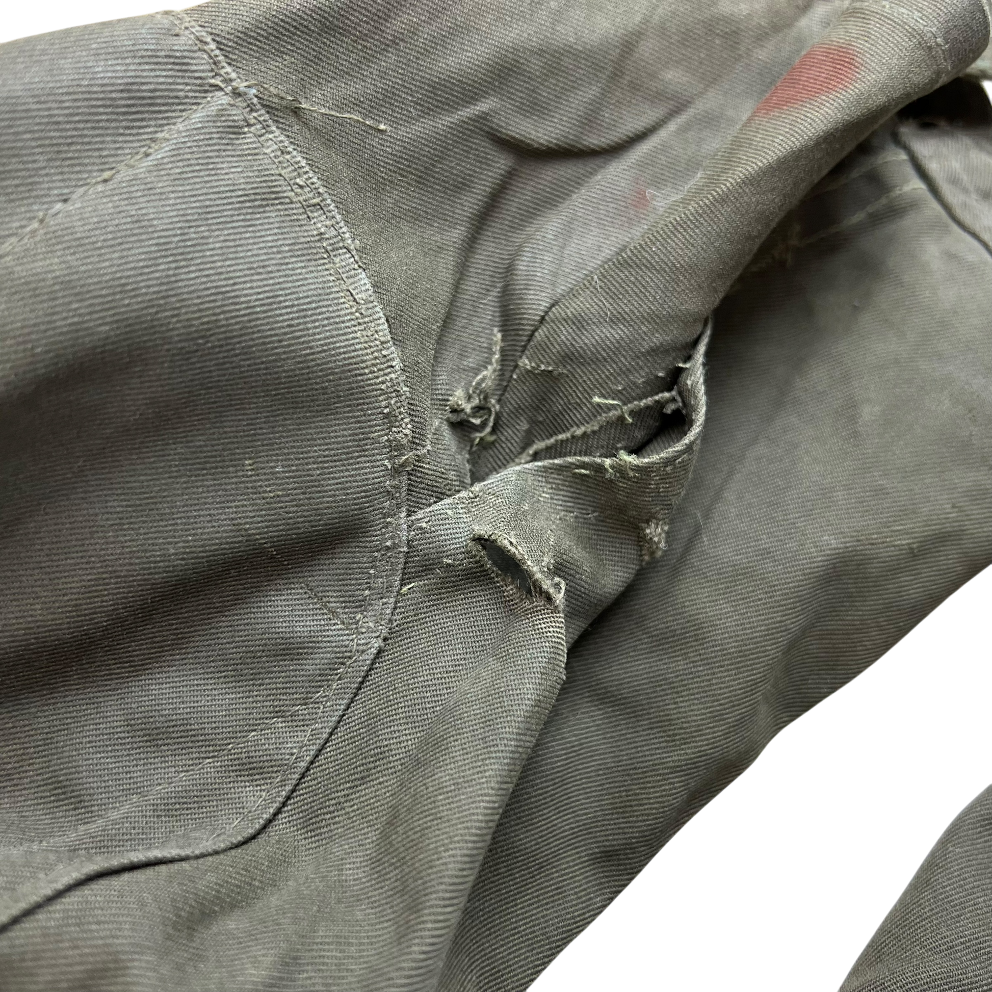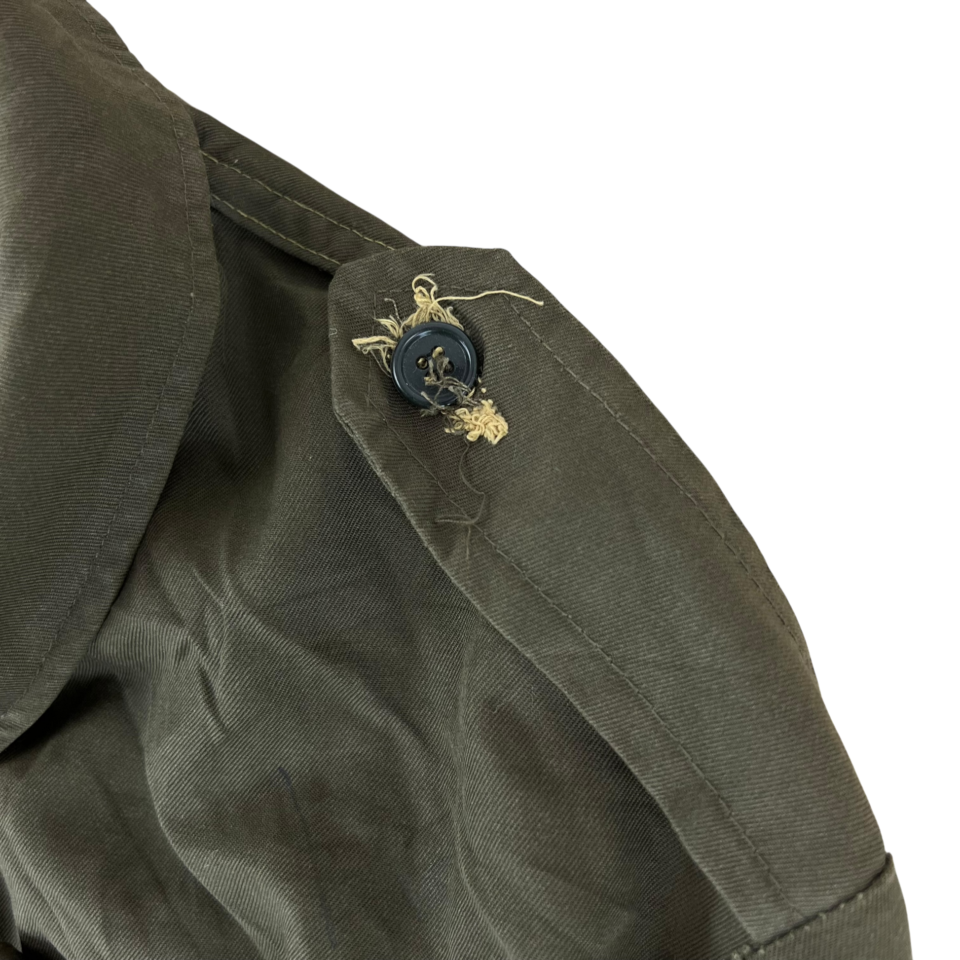 - Grade 2 - A great restoration or reworking piece, in need of a bit of care. The jacket is missing a button off the shoulder epaulette and there are a few small holes and marks. Rust on the armpit holes too due to long term storage.