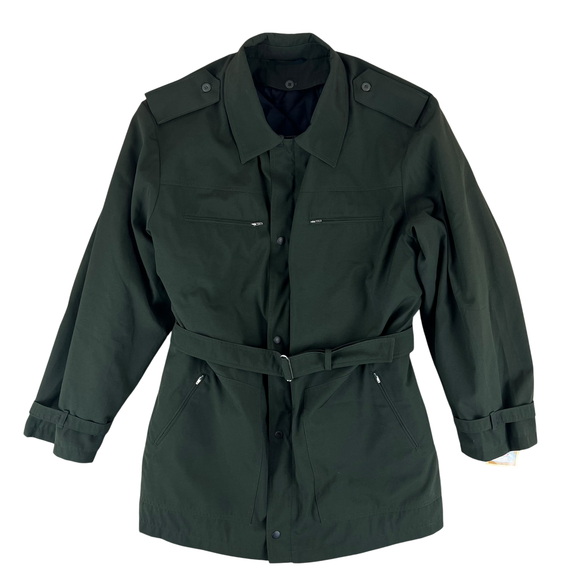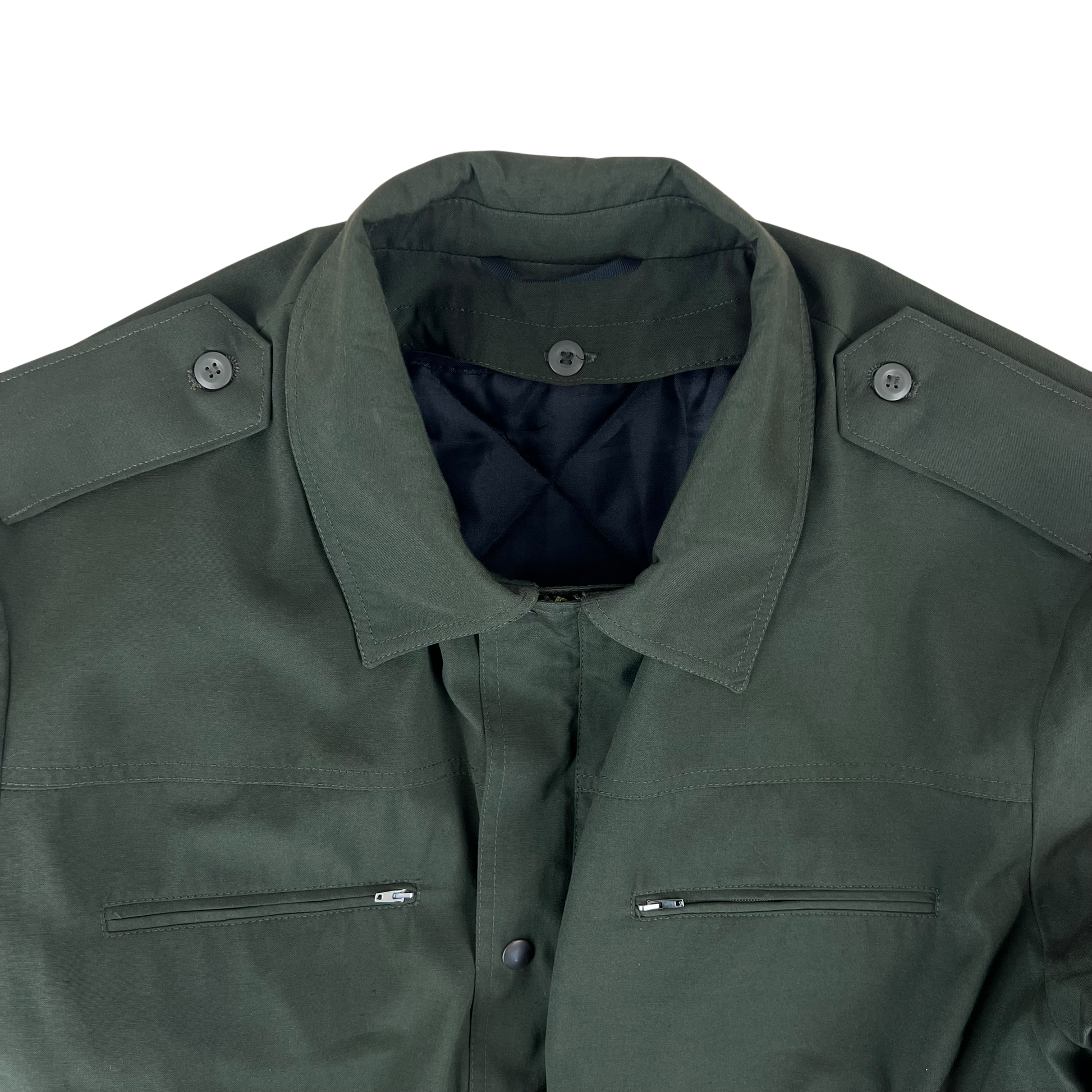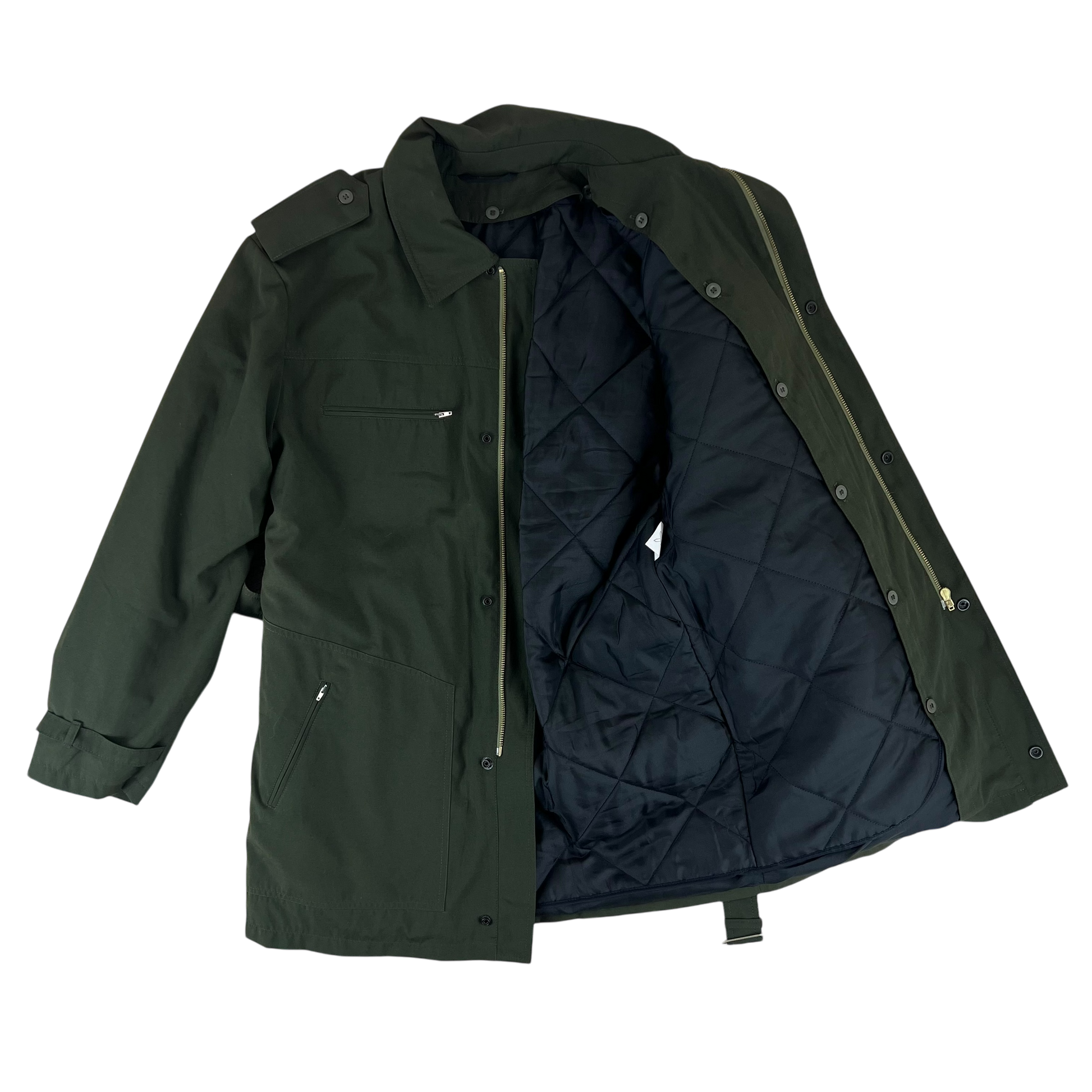 For features you have 4 zipper pockets, 2 on the chest and 2 on the hips which double up as handwarmer pockets. There is a wonderful thermal quilted liner which can be detached at any point to suit all seasons. For a more tailored look you'll find both the cuffs and waist have a belt. The whole coat comes in a solid Slovak olive drab colour, great for outdoors themed wardrobes.