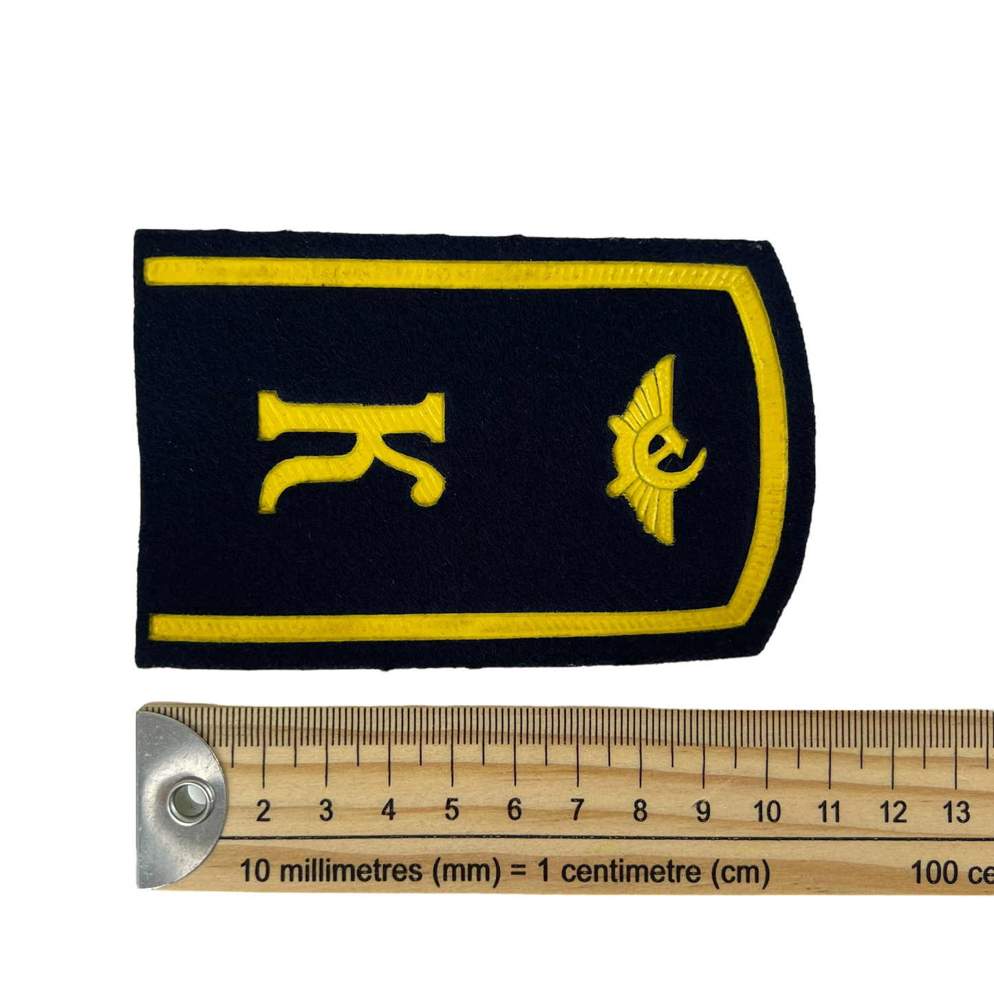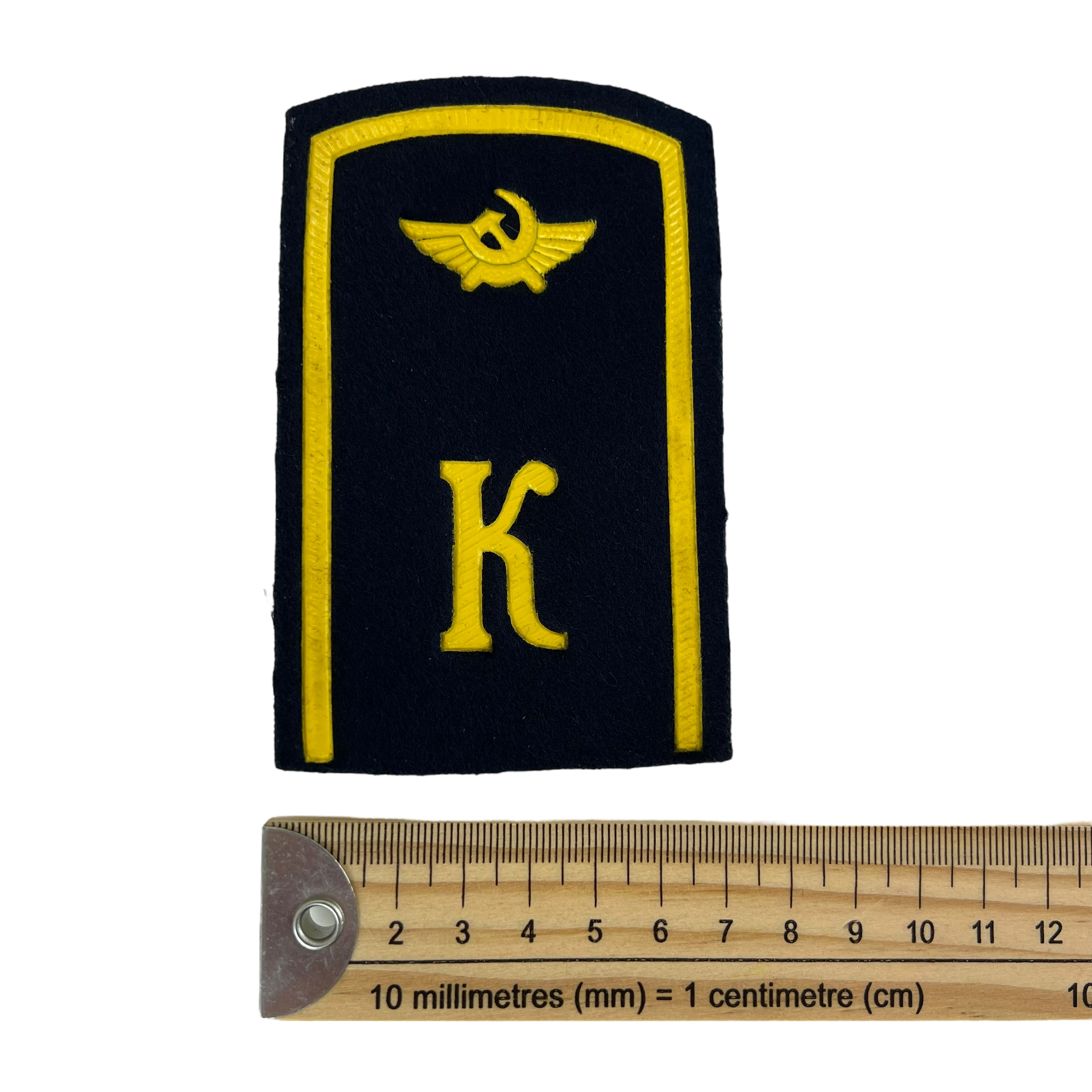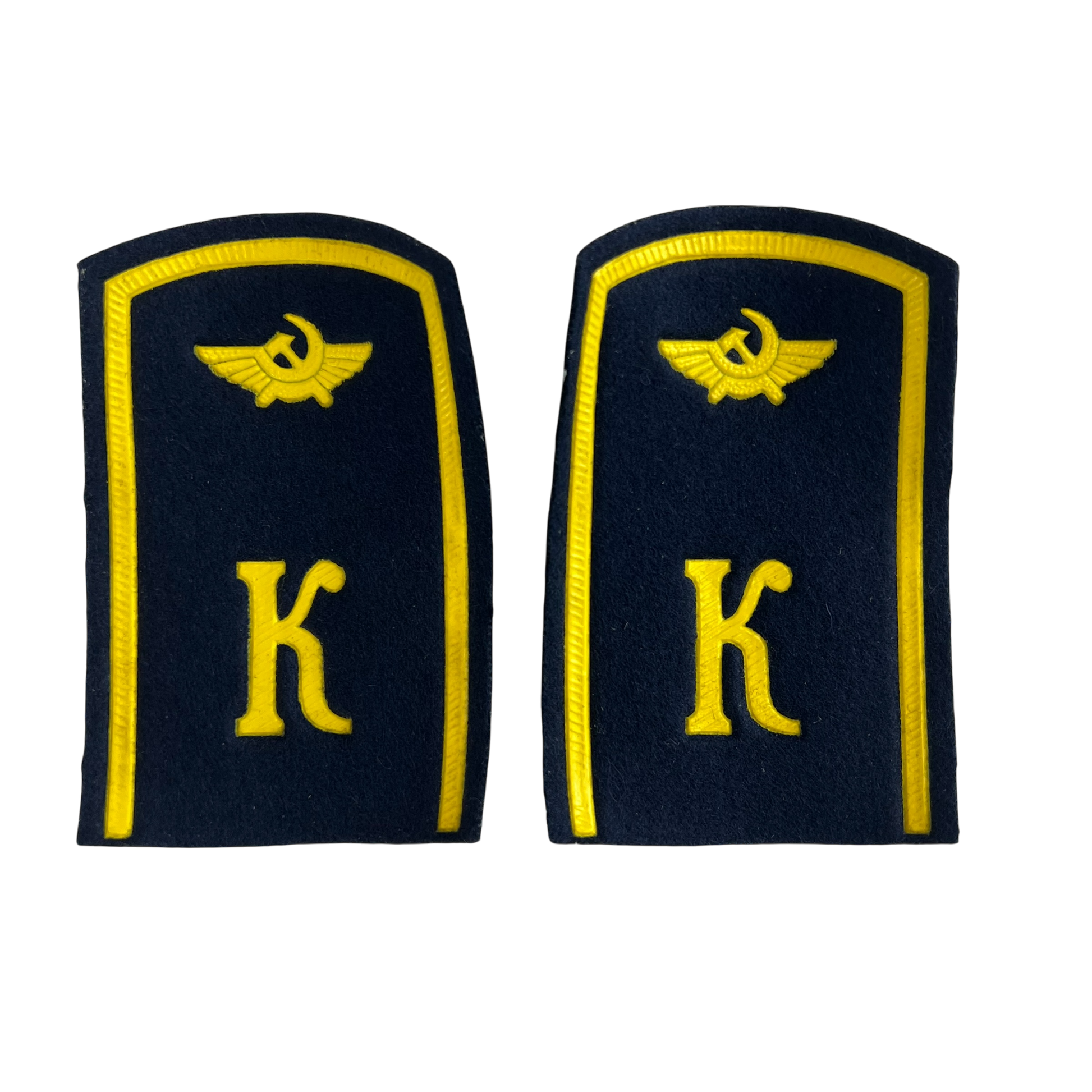 Seen on the uniforms of future Soviet pilots, these lovely gold and navy rank boards added a touch of elegance to the cadets' jacket while going through rigorous training. The rank boards feature a prominent "K" for "kadet" as well as the logo of the Soviet Air Forces. A great touch to a reenactment piece or as a little addition to your collection.