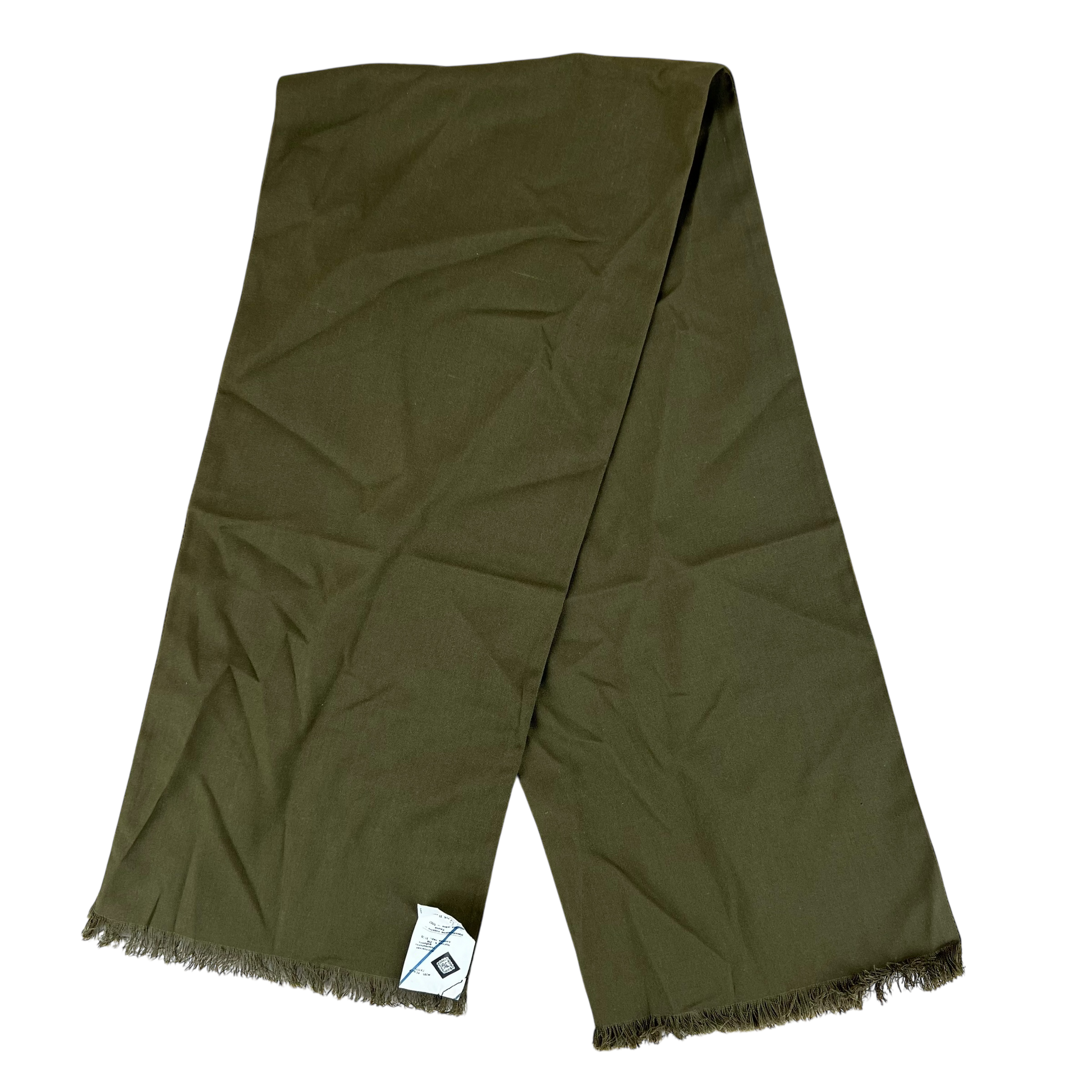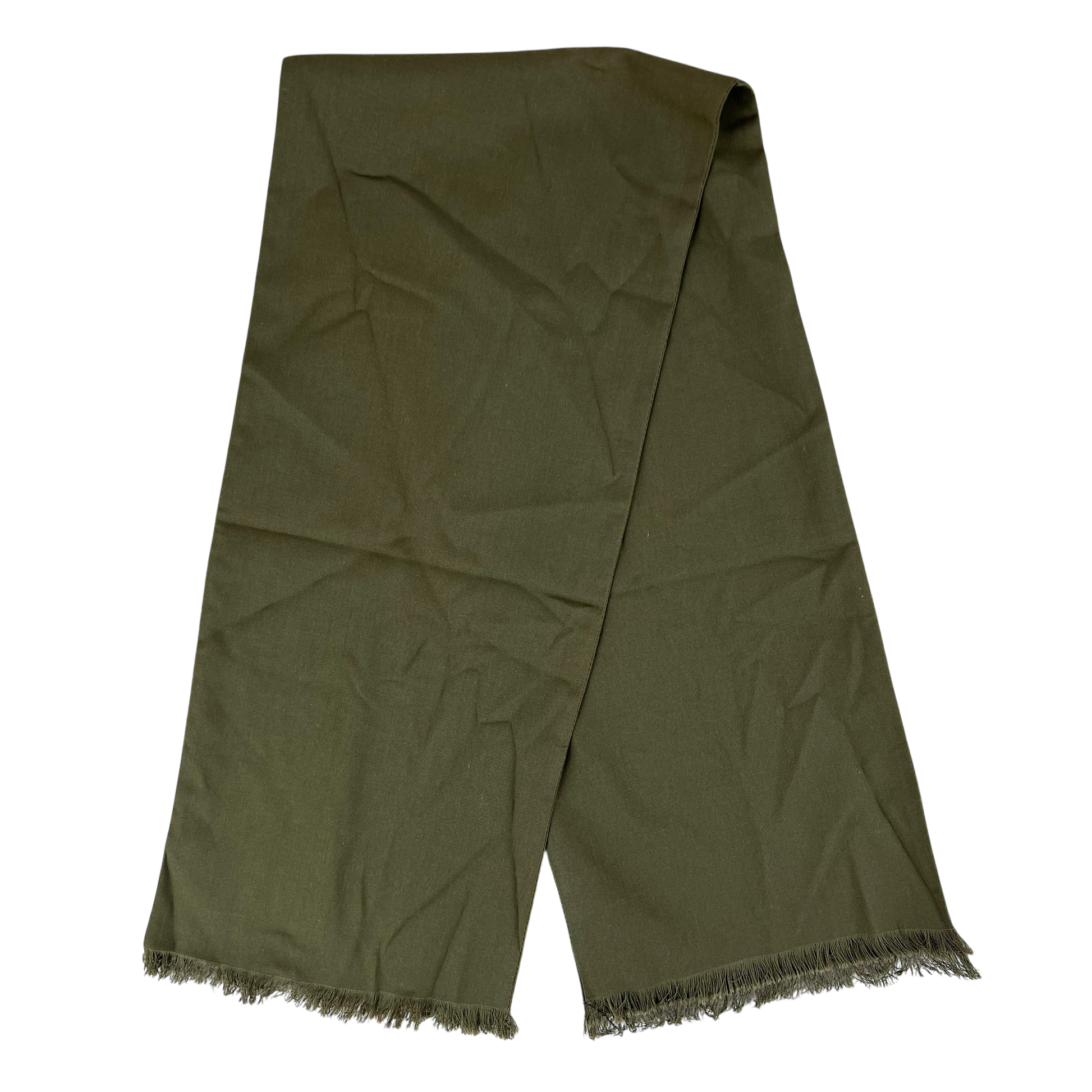 The scarf is a solid olive drab colour with a gentle sheen due to the material blend. Perfect for complementing brown and ochre colours or to contrast against something a more bold!
