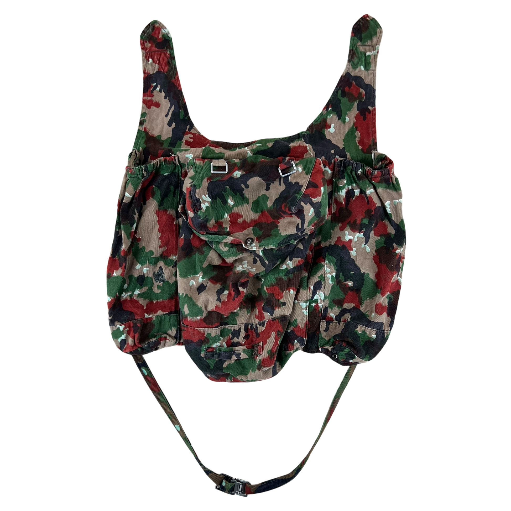 The Swiss Army TAZ57 Alpenflage Camouflage Rucksack is a distinctive piece of vintage military gear, featuring the unique Alpenflage camouflage pattern used by the Swiss military. Made from durable, heavy-duty cotton material, this rucksack is designed for rugged outdoor use, making it a popular choice for hikers, campers, and military surplus collectors. It was designed to go hand in hand with the iconic and beloved Swiss parkas of the time to provide a jacket with countless pockets with even more storage.