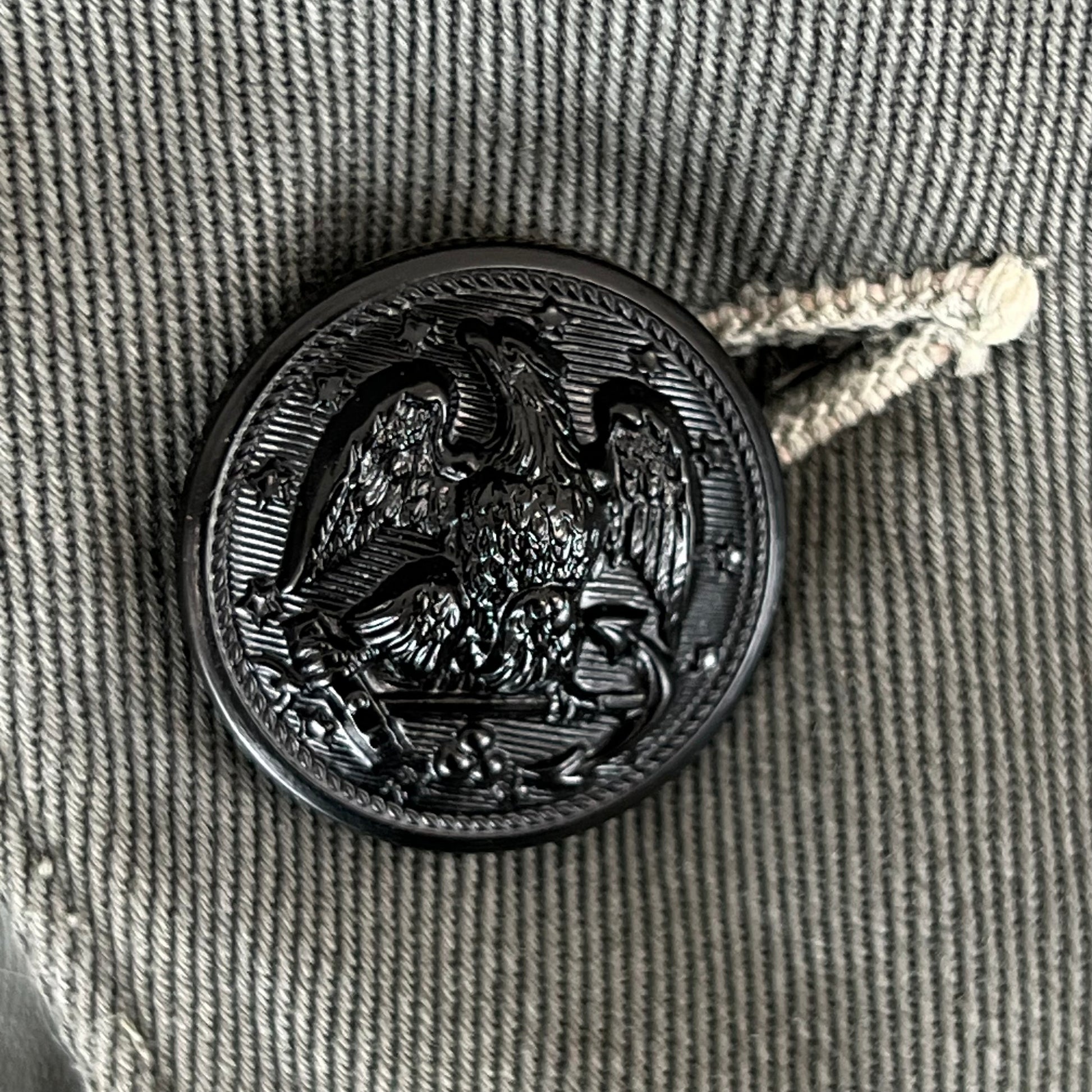 - Grade 2 / Original Condition - Over all in good shape for a piece made so long ago. No holes or tears but has a couple of grubby areas from long term storage. Has 1 missing button off the one pocket. Excellent restoration piece.
