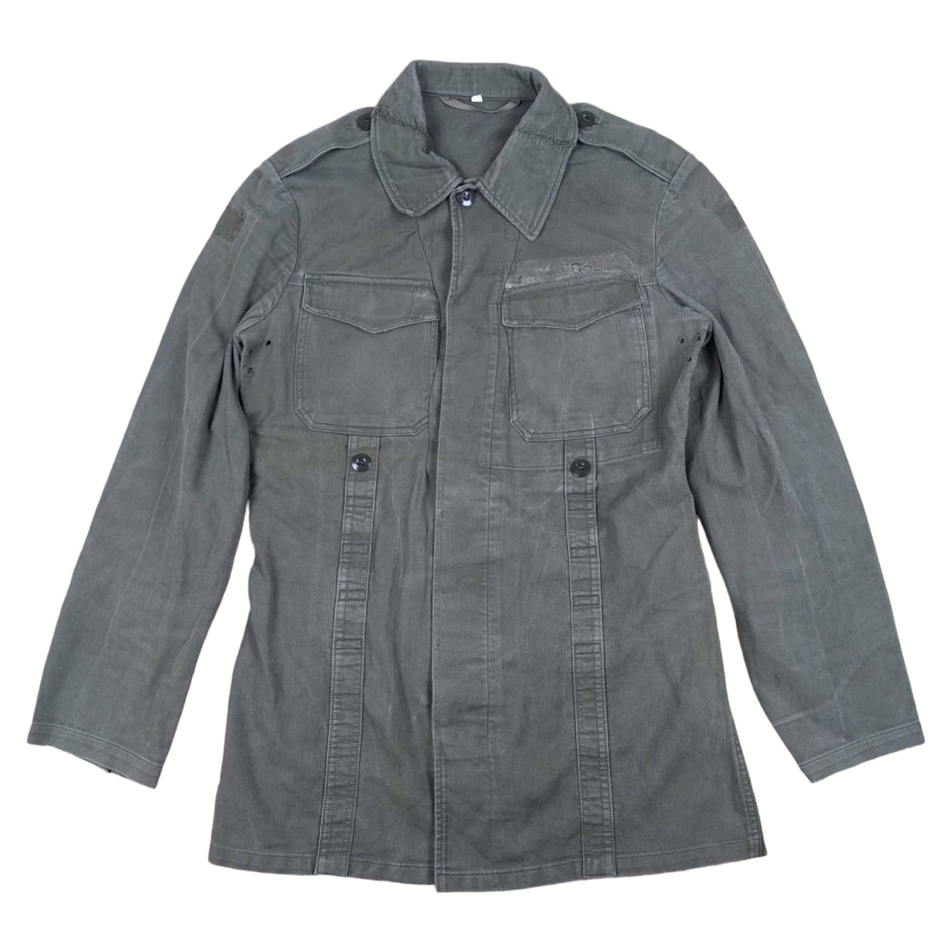 The shirt comes with 2 button chest pockets for all your bits and pieces. The sleeve cuffs can be adjusted to meet your needs and if carrying gear you can fasten it on board with the shoulder epaulettes. The shit is completely field grey in colour. A great piece of Cold War kit and the numerous repairs certainly show a soldiers love of this shirt!